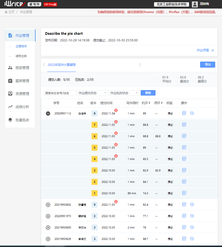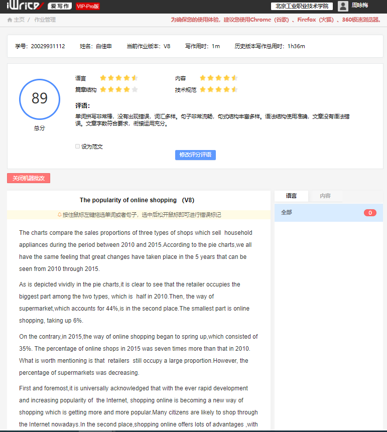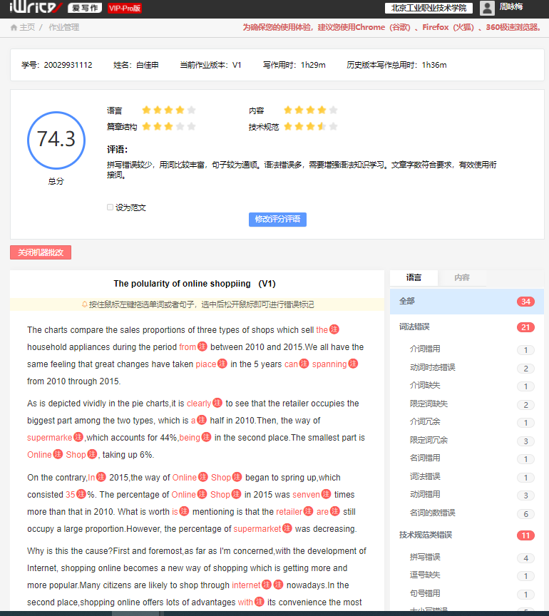 “中国教育电视台·外研社杯”职场英语挑战赛写作大赛(高职组)是由教育部职业院校外语类专业教学指导委员会指导、外语教学与研究出版社主办的面向高职高专学生的全国性公益赛事。大赛本着“以赛促教”、“以赛促学”、“以赛育人”的理念,助力高等职业院校人才培养模式创新和外语教育教学改革。学生用文字阐述观点、用语言表达思想,所取得的骄人的成绩,也凝结着指导教师,以及指导教师所在的公共英语教研室所有英语教师团队的不懈的努力和辛勤的汗水。一年来,公共英语教研室在学院领导的带领下,多次进行线上线下教研活动,研讨写作教学的新模式,充分利用各种信息化手段,提高写作教学效率。我院孙川副院长带领英语教研室教师跟外研社合作的课题:基于iWrite智能评阅平台的英语写作教学策略研究,以高职学生为样本,追踪其在使用iWrite平台过程中英文写作各个维度的成绩变化,结合成绩分析,争取达到运用现代信息技术辅助传统英语写作教学,优化教学质量的效果。写作大赛的选手们充分利用了这一教学资源,在iwrite 写作平台进行线上写作,从开始的满篇红色错误提示到最后的零错误,学生的作文成绩一次比一次高,信心也一次比一次足。