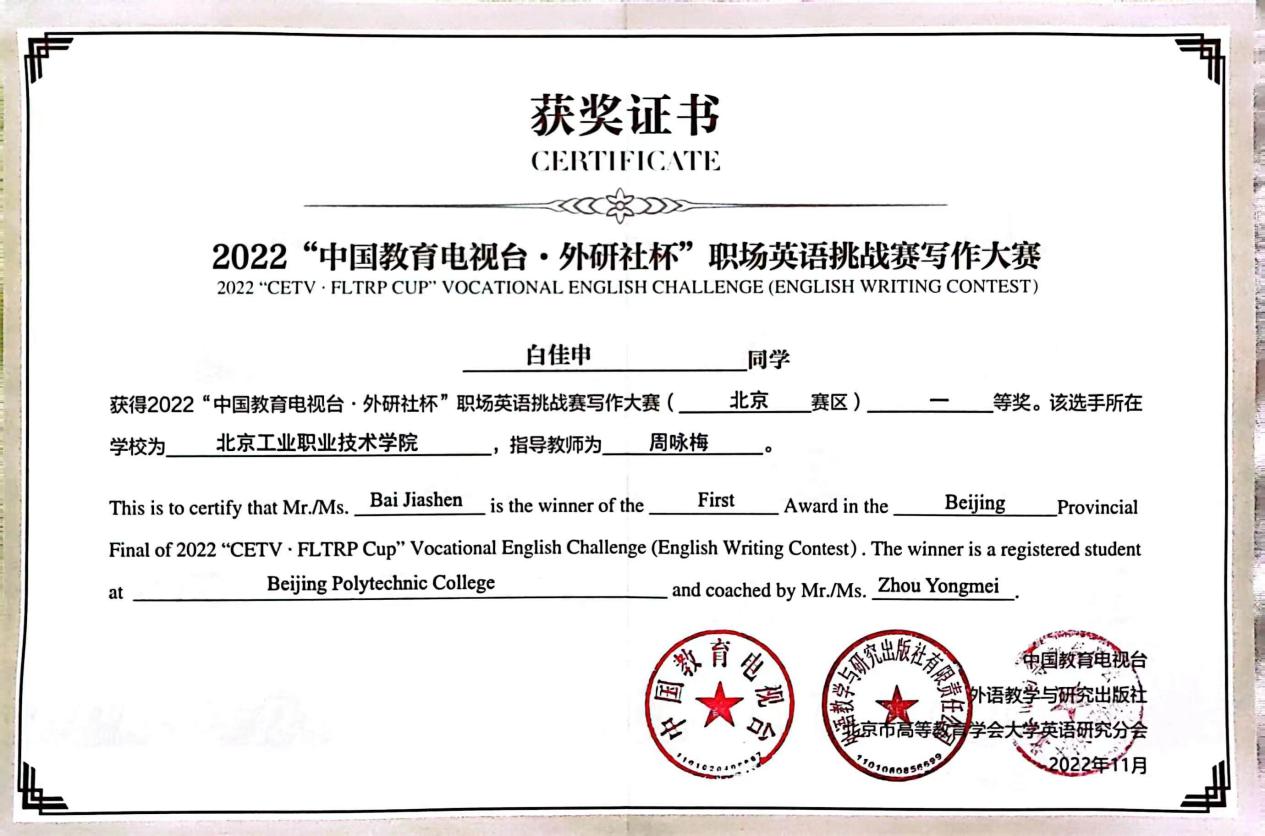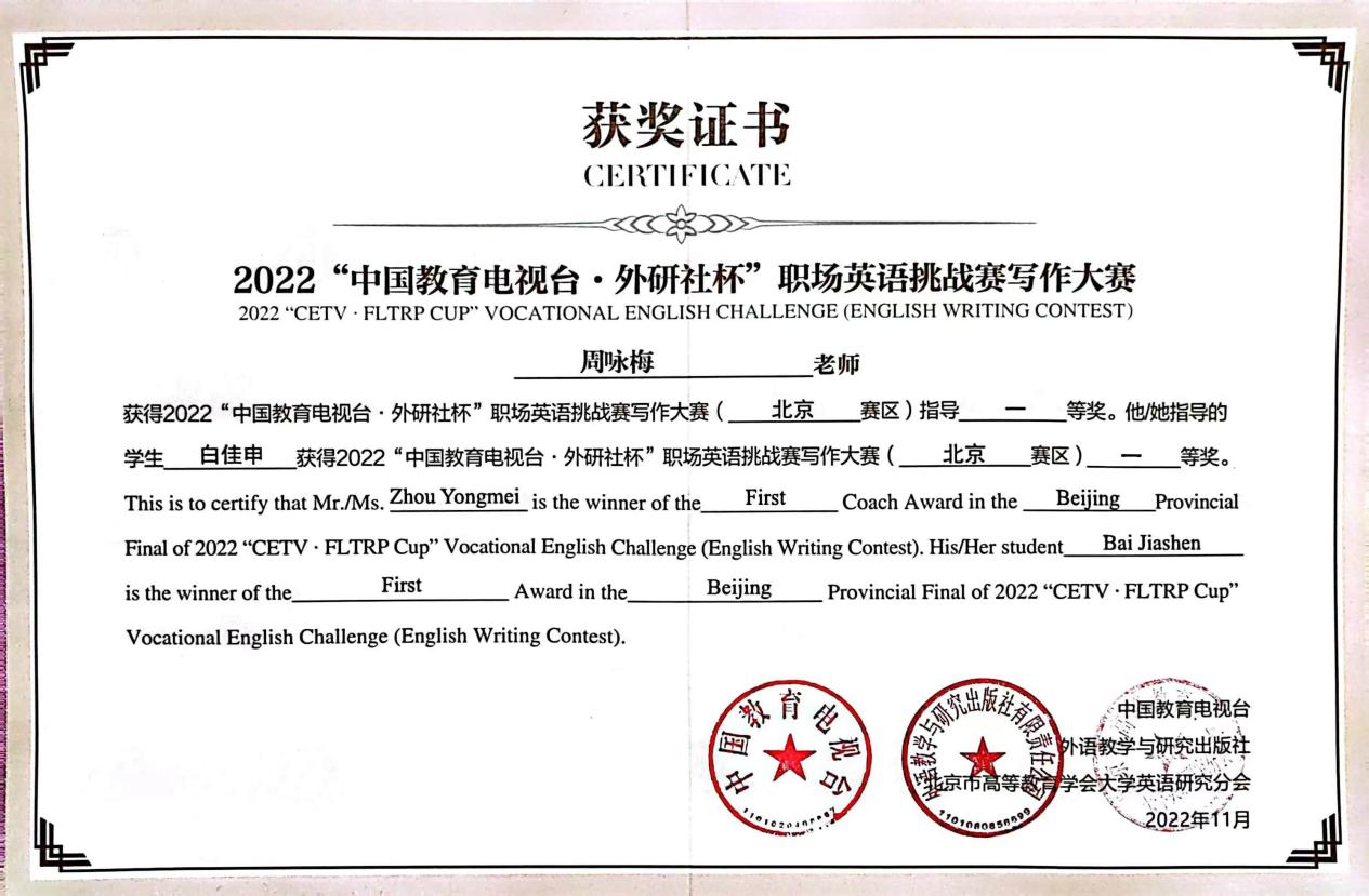 由中国职业技术教育学会、中国教育报刊社共同指导,中国教育电视台、外语教学与研究出版社联合主办的“中国教育电视台·外研社杯”职场英语挑战赛写作大赛(高职组)北京赛区成绩出炉。来自全市30余所高职院校的50多名学子以笔为锋,竞技文思,在挑战赛的舞台上精研写作技能,淬炼语言艺术,展青春风采,绽时代芳华。我校大数据与会计2032班的李泽文同学、网络2232班的白佳申同学、信息安全2131班的陈睿琦同学代表我校参加了此次大赛,李泽文、白佳申获得一等奖,陈睿琦获得三等奖,指导教师周咏梅老师获得优秀指导教师奖。