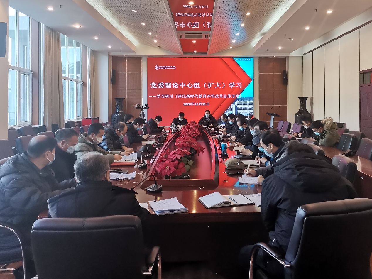 12月31日上午,开云网党委理论学习中心组在第四会议室召开理论学习扩大会,专题学习中共中央、国务院印发的《深化新时代教育评价改革总体方案》(以下简称《总体方案》),研究部署开云网学习贯彻落实的意见。校党委书记王伟主持学习会,党委理论学习中心组成员,党政办公室主任、宣传部长、学工部长、教务处长、人事处长、教学质量监控中心主任、党总支书记、直属党支部书记参加了学习研讨。
