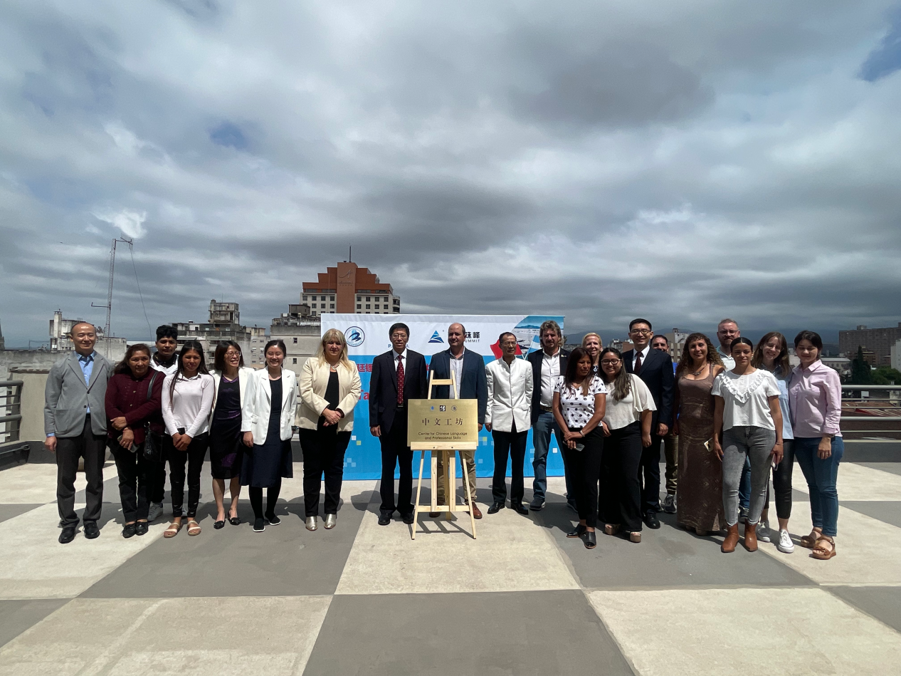 阿根廷当地时间2023年10月31日上午,我校与教育部中外语言交流与合作中心(以下简称语合中心)、西藏珠峰资源股份有限公司(以下简称西藏珠峰)三方共建的阿根廷锂钾中文工坊揭牌仪式在阿根廷萨尔塔省工程师协会正式举行。