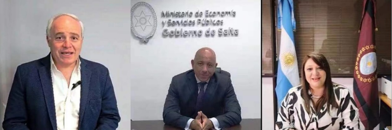 阿根廷萨尔塔省教育、科学和技术部长马蒂亚斯·卡内帕(Matías Cánepa)(左一)、阿根廷萨尔塔省经济和公共服务部部长罗伯特·迪布·阿舒尔(Roberto Dib Ashur)(图中)、萨尔塔能源和矿业秘书 罗米娜·萨萨里尼(Romina Sassarini )(右一)等领导发表视频致辞