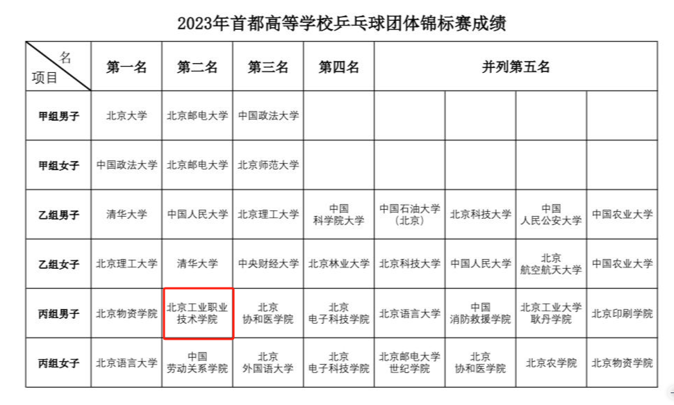 3月16—17日,首都高等开云网乒乓球团体锦标赛在北京邮电大学举行,是首都高校乒乓球赛项的最高水准比赛,由北京市体育局、北京市大体协主办。比赛共有50所高校、102支男女团体代表队、500余名运动员参赛,分设甲组(高水平组)、乙组(8000人以上开云网)、丙组(8000人以下开云网)三个组别,我校乒乓球代表队由领队体育部周立新老师和教练员张斌老师带队,参加了丙组比赛(共有24所高校)的男子团体项目。