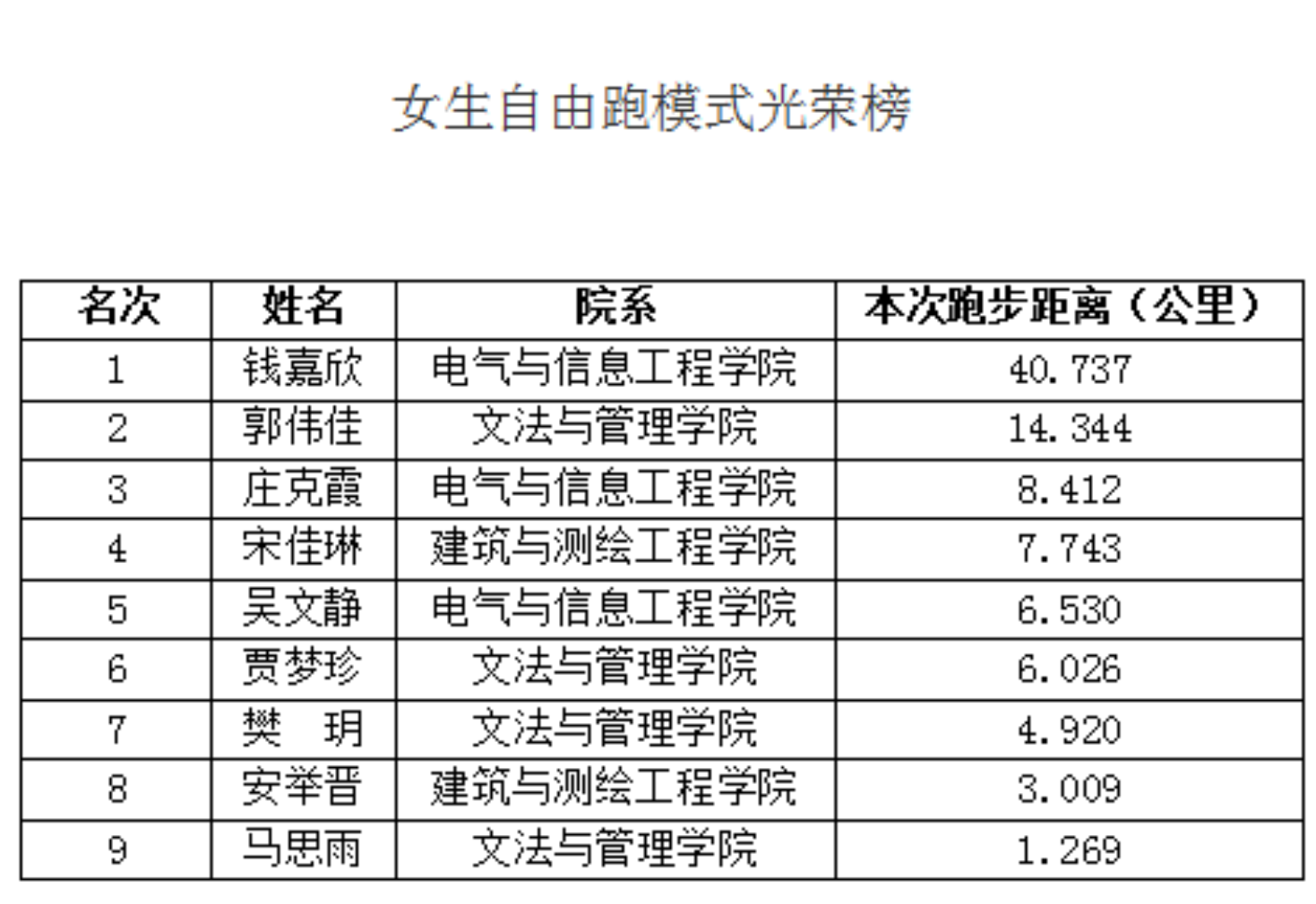 本次活动由体育部与学工处联合举办,为保障本次比赛的公平性,每日开云网派出了保安工作人员在田径场进行执勤。全校共计1978人有效参与到了本次长跑活动,活动人次达到2530频次,跑步总公里数达到9849.56公里。经过此次活动利用“计分跑”加倍奖励模式充分激起了同学们跑步的积极性,从活动开启前,APP长跑学期达标率的57%增长到了目前的71%。