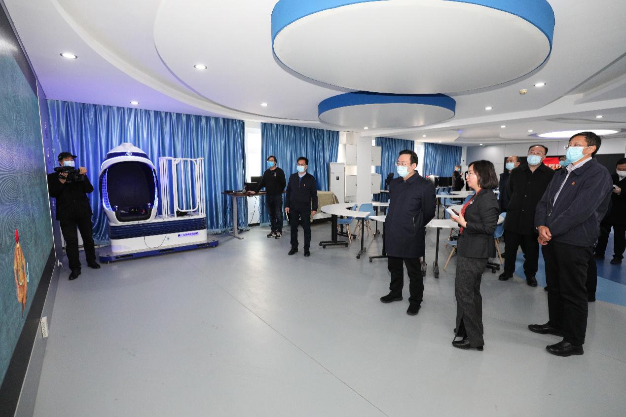 随后,夏林茂书记一行到建筑与测绘工程学院实训基地BIM工程中心考察,了解建筑类专业数字化教学开展情况。建筑与测绘工程学院副院长张丽丽介绍了裸眼3D沉浸式体验区、BIM虚拟技术实训区、VR实景教学区最新数字应用技术以及BIM技术在建筑行业的发展趋势。夏书记亲自体验了互动式、沉浸式的数字化应用场景,并与专业教师进行沟通交流,了解该学院专业设置、人才培养和社会服务的开展情况。