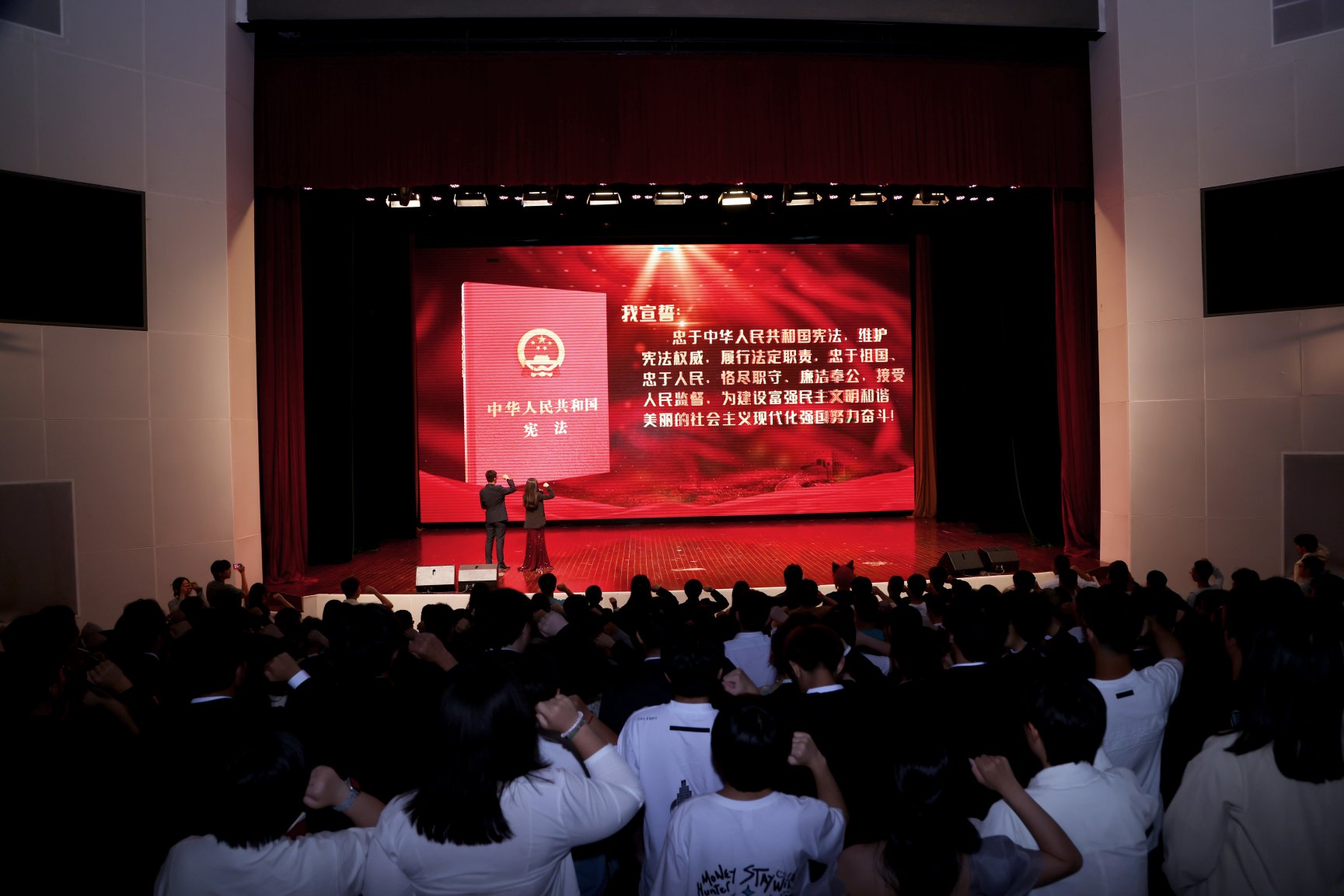 期间举行宪法宣誓环节。家长和学生阅读《给彼此的一封信》。纸短情且长,诚意胜千言。很多父母会把爱藏在心里,也许在书信中他们只字不提爱,但生活里处处都是爱。正如学子们在书信中所写,“一路跌跌撞撞的走来,少不了父母的辛苦劳累和精心呵护,更少不了他们的日夜陪伴与支持,还有那些带我走进知识海洋的恩师们,陪伴我前行的伙伴们,谢谢他们在我成长的道路中,不离不弃,教我成长!”