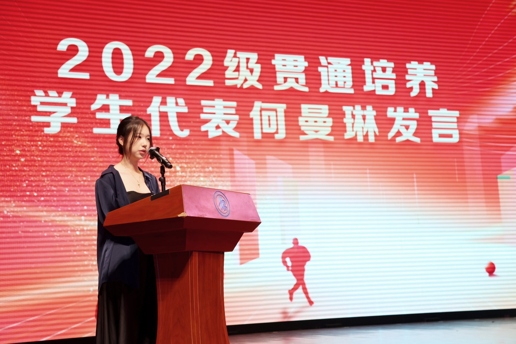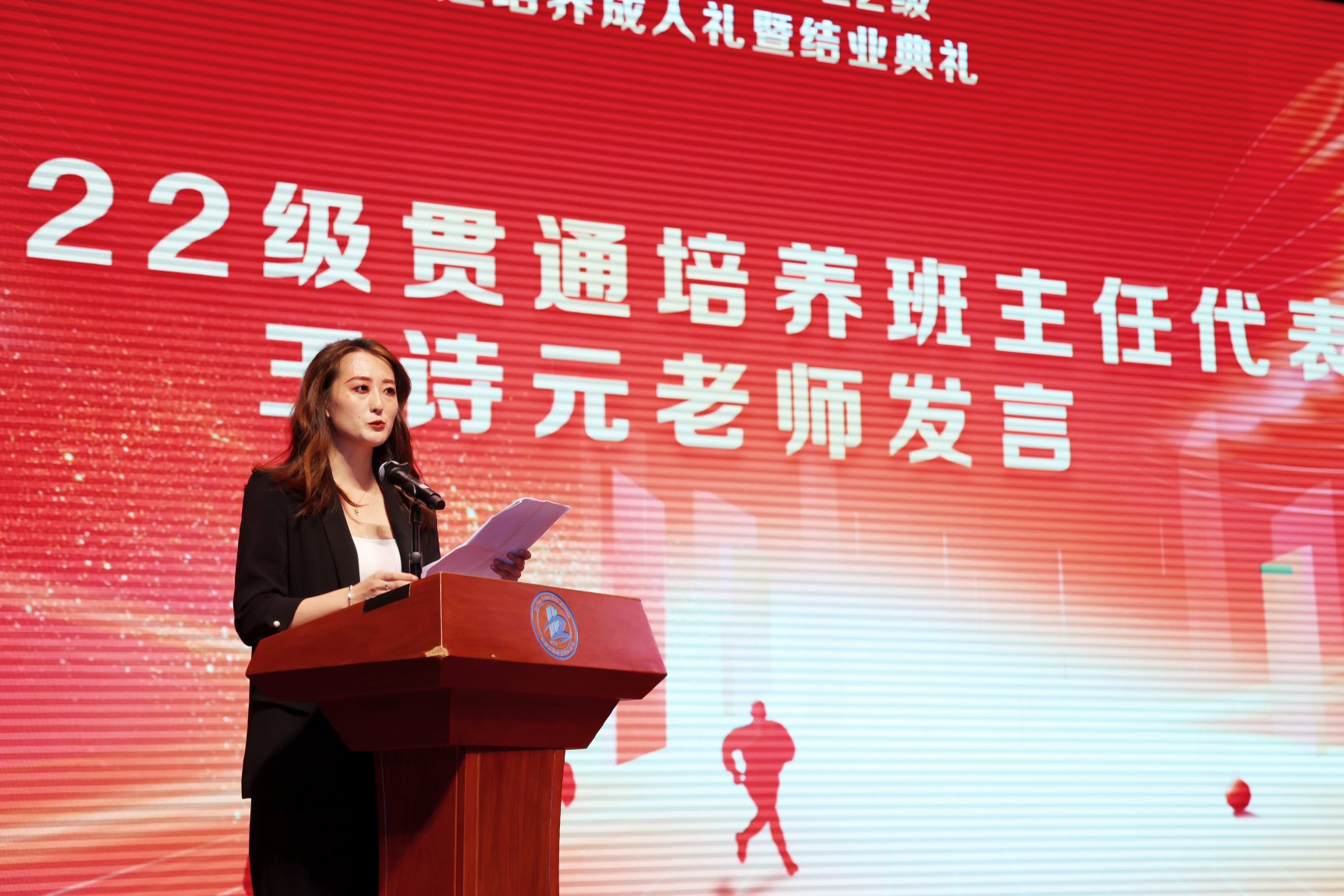 随后,举行了2022级贯通培养优秀结业生颁奖和2022级贯通培养班主任答谢仪式。班主任王诗元代表老师发言,她为学生送上一份叮嘱,一份期盼,希望同学们可以拥抱有曲线的人生。同时,放眼未来的无限性,追逐不设限的人生。