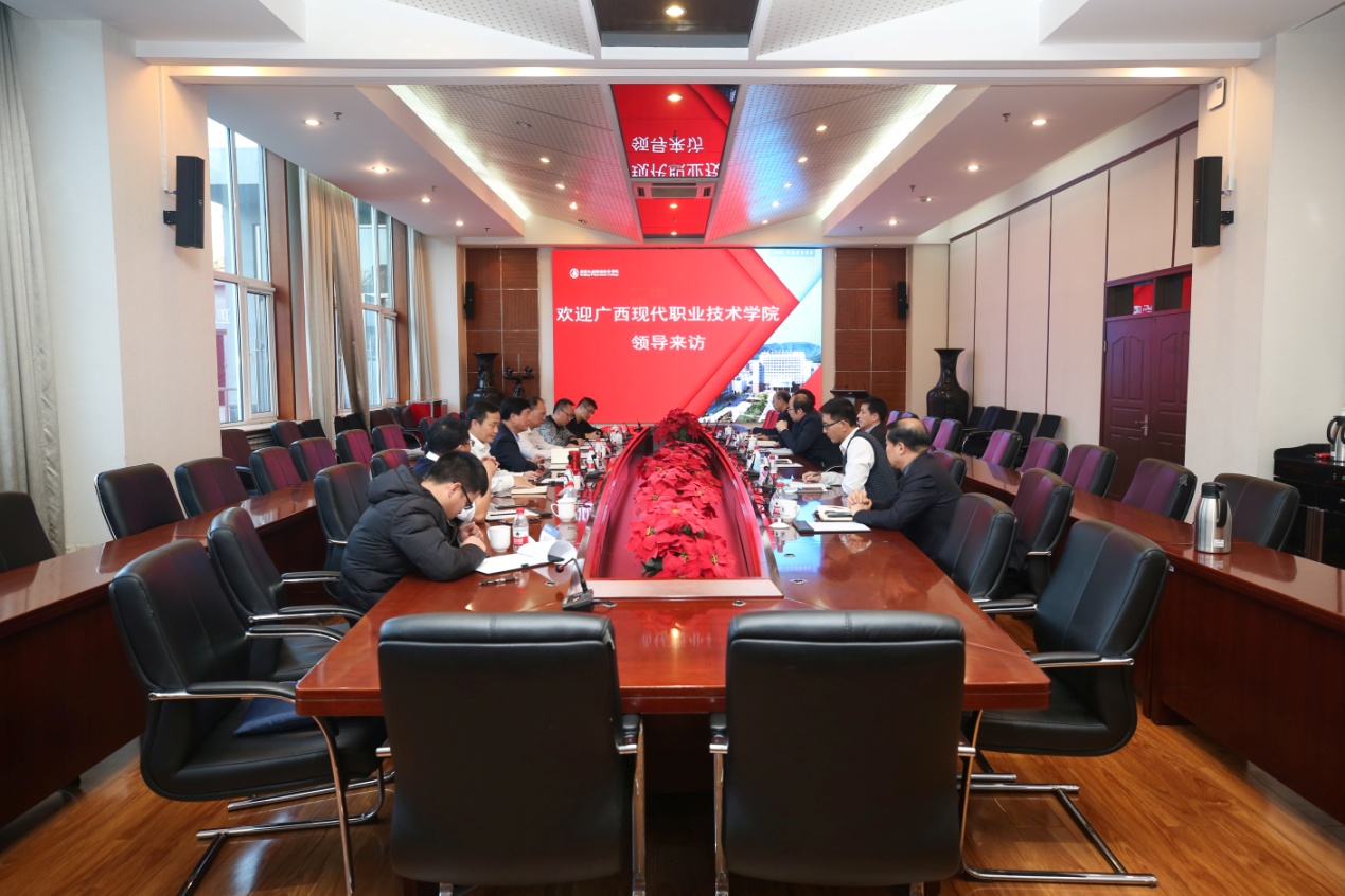 11月23日,广西现代职业技术学院党委书记韦伟松、副院长杨奎等一行7人到我校考察交流,我校党委书记王伟,党政办公室、党委宣传部、机电工程学院、建筑与测绘工程学院、电气与信息工程学院、文法与管理学院负责人参加了座谈会。