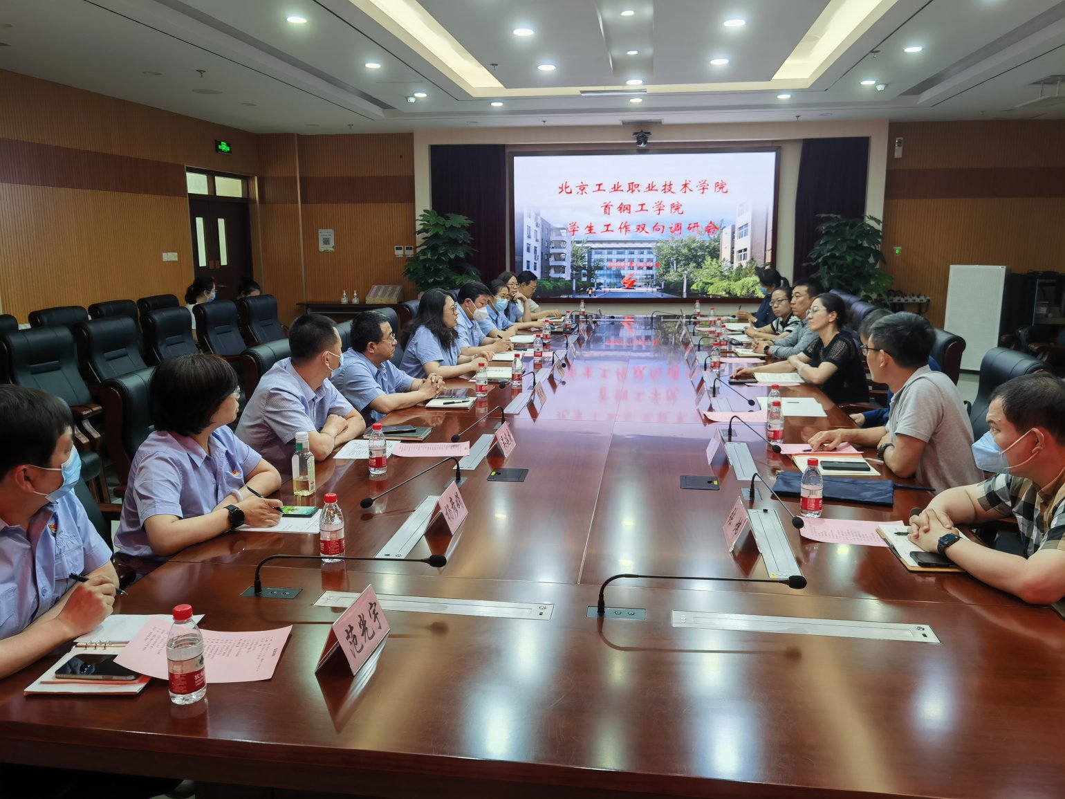为深入开展学习贯彻习近平新时代中国特色社会主义思想主题教育,在全党大兴调查研究之际,校党委常委、副院长沈莹带领学生工作部部长梁文学、招生就业处副处长侯瑾、团委副书记赵萌、二级学院党总支副书记以及相关工作人员,于2023年6月1日赴首钢工学院开展有关学生教育管理工作特色、班主任辅导员队伍建设、就业等工作的调查研究工作,首钢工学院副院长周伯久、学生处处长宋晨辉、各二级学院院长、副院长以及相关负责人参加调研。
