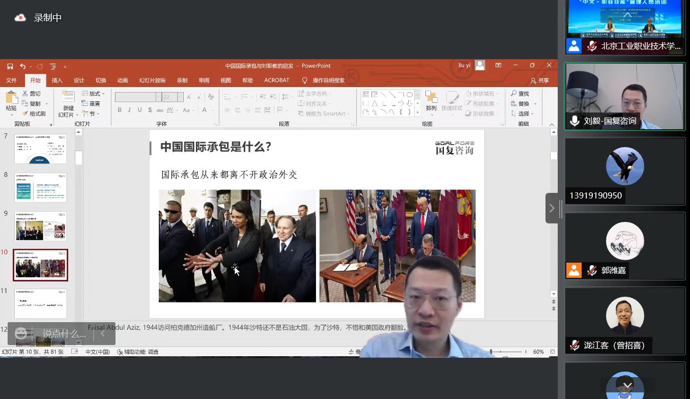 国复咨询执行董事刘毅博士作了题为“中国国际工程发展趋势与职业教育的启发”的主题报告。刘毅博士从中国国际承包的内涵定义出发,阐述了中国国际工程承包行业的发展历程并结合当前国际形势和行业发展趋势为职业教育发展提供了发展思路和建议。他提到,职业教育迎来大好发展时机,各职业院校应从被动辅助式的角色转变成主动新型校企合作关系主体,坚持共商、共建、共享,推进校企深度合作发展。