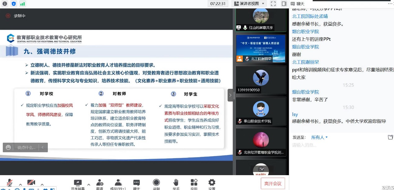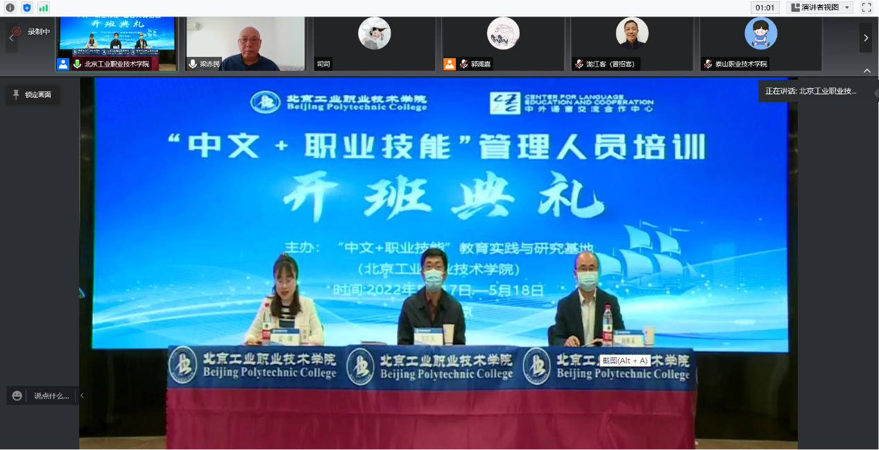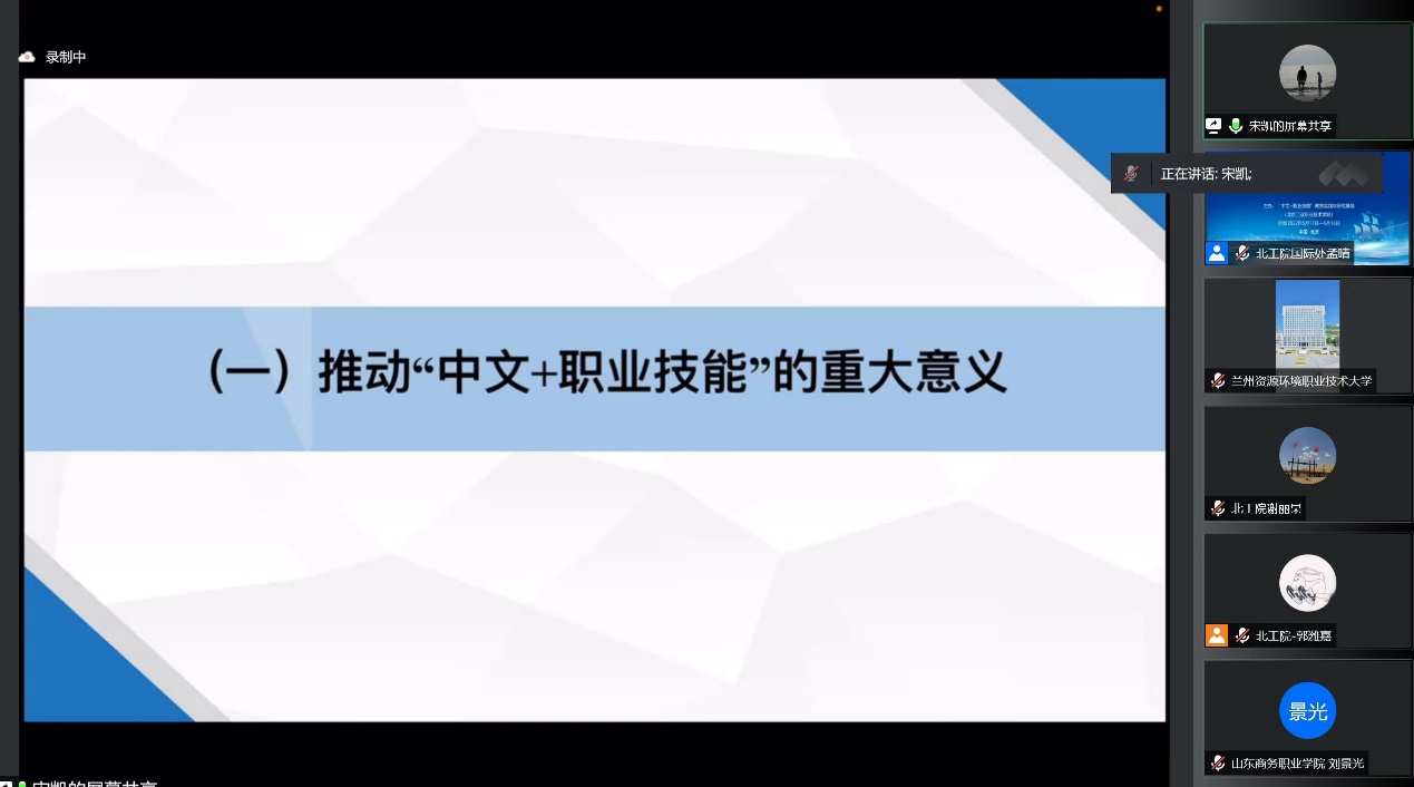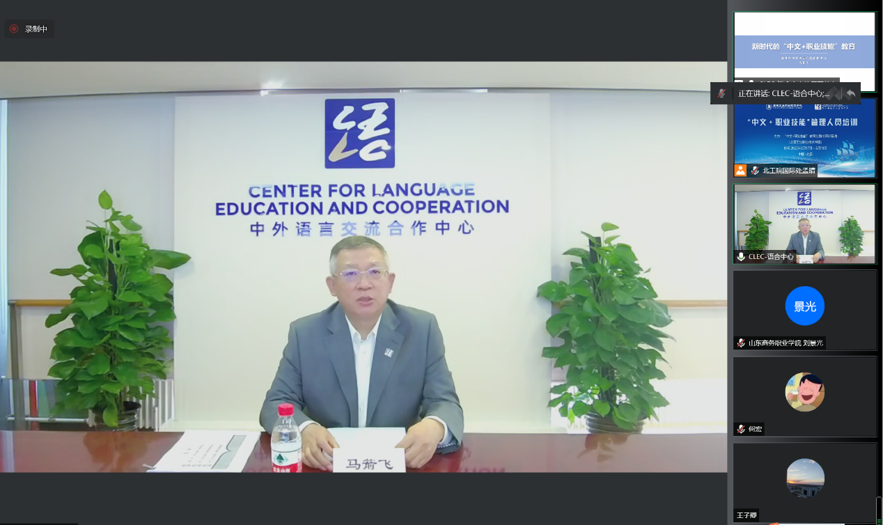 为贯彻落实中共中央办公厅、国务院办公厅印发《关于推动现代职业教育高质量发展的意见》,推动国际中文教育与职业教育“走出去”融合发展,构建“中文+职业技能”教育高质量发展新体系,5月17日至18日,开云网“中文+职业技能”教育实践与研究基地举办了“中文+职业技能”管理人员线上培训,来自全国各地87所职业院校的262名校领导、国际处室负责人和教师参加了培训。