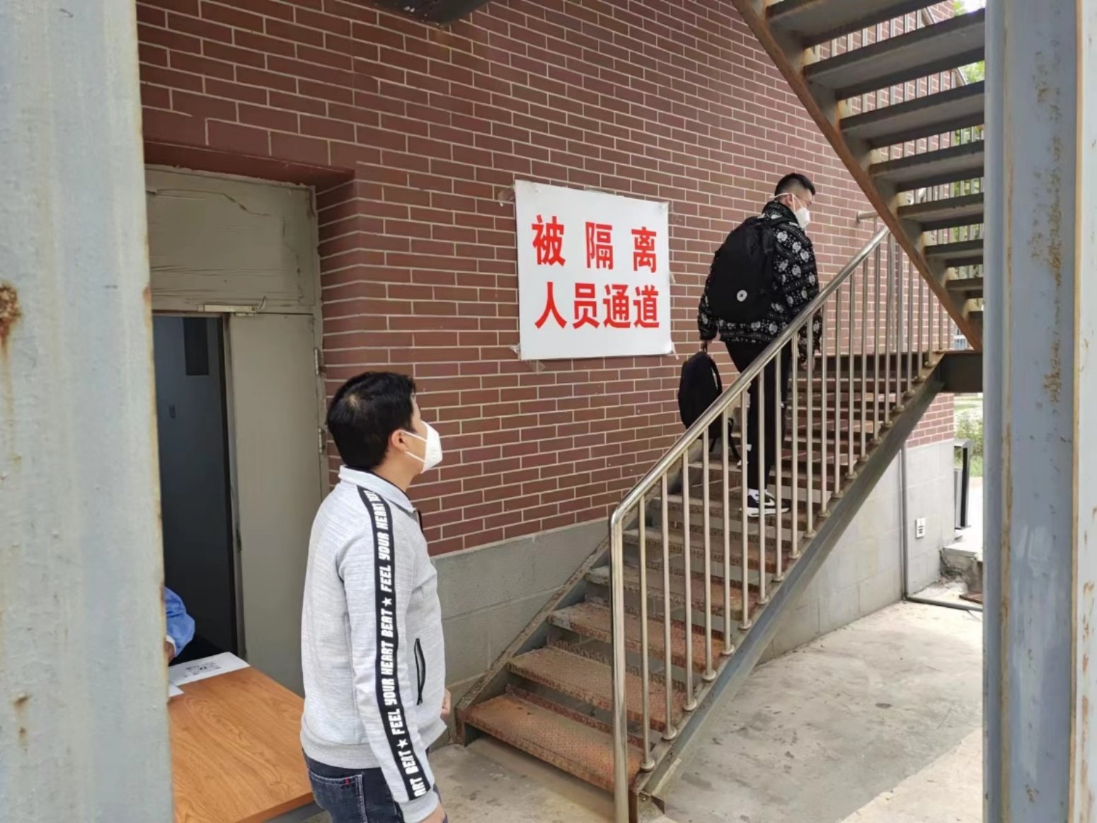 班主任王昫在入口登记学生信息,并送学生入住健康驿站