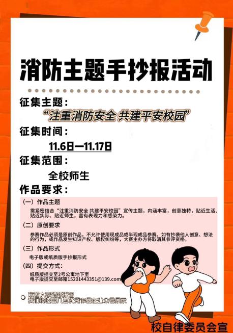 学生工作处11月6日开展主题为“注重消防安全,共建平安校园”的主题手抄报活动,倡导学生通过学习查阅消防安全知识,用自己的笔触和感想,将消防安全常识付诸于笔端,描绘于画纸。