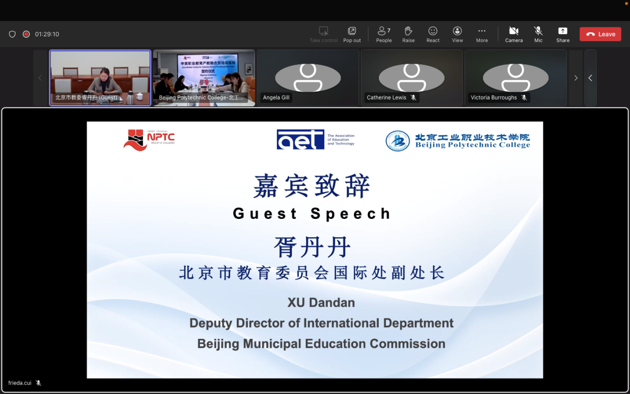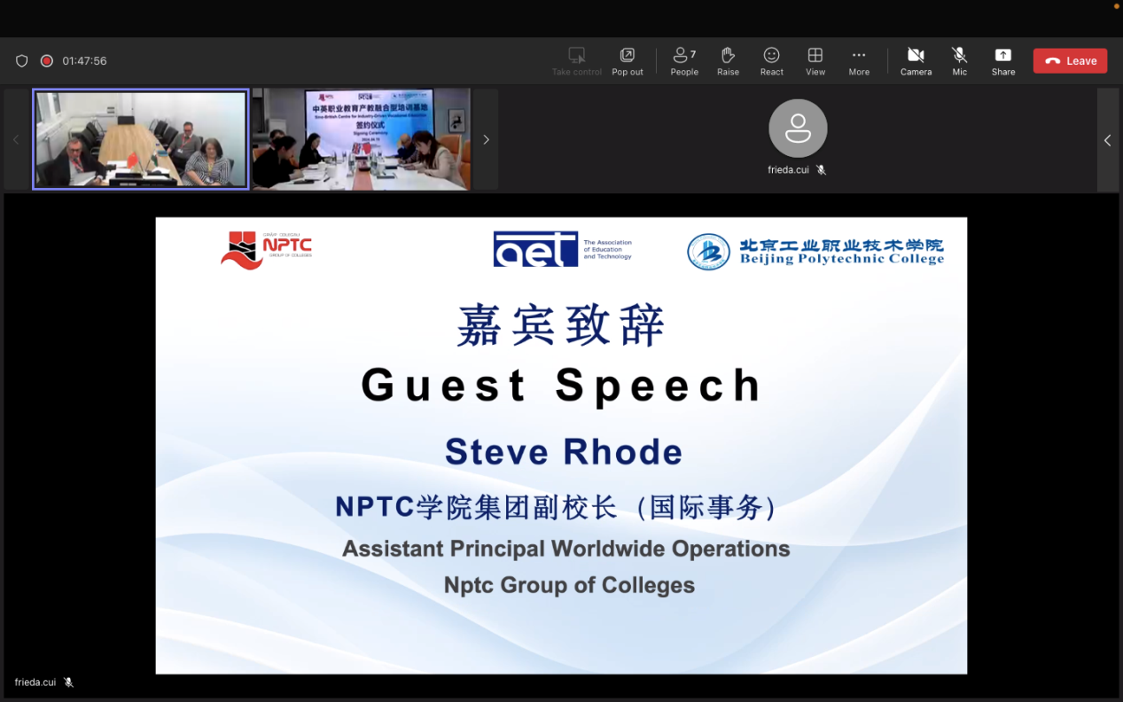 NPTC学院集团代表Steve Rhodes 线上出席会议并做发表讲话。NPTC是英国最著名的职业学院之一,多年来,我们与中国多所学院沟通交流,并开展千名职业教师项目,帮助其实现从教室、工厂和培训基地到以行业驱动的职业教育转型,弥补劳动力技能差距,从而支持中国经济发展,让学生具有实用技能和深入理解最新行业实践的高素质从业者。