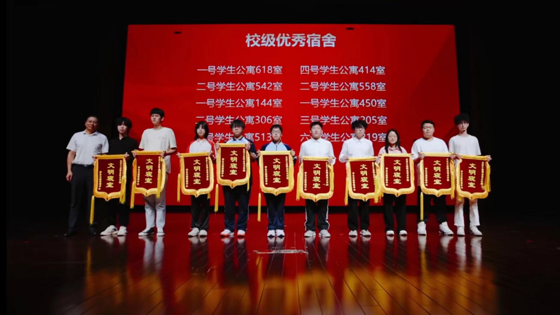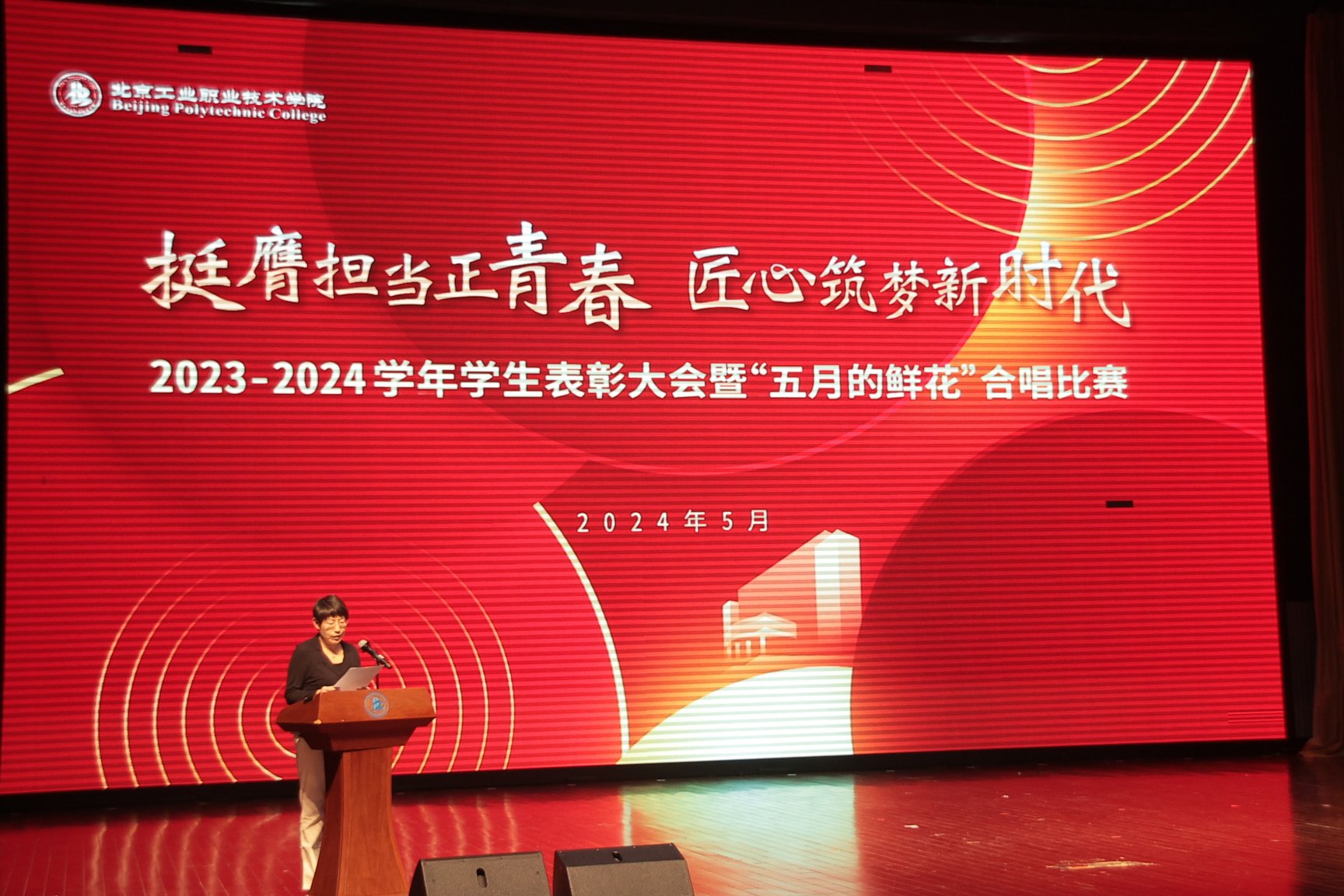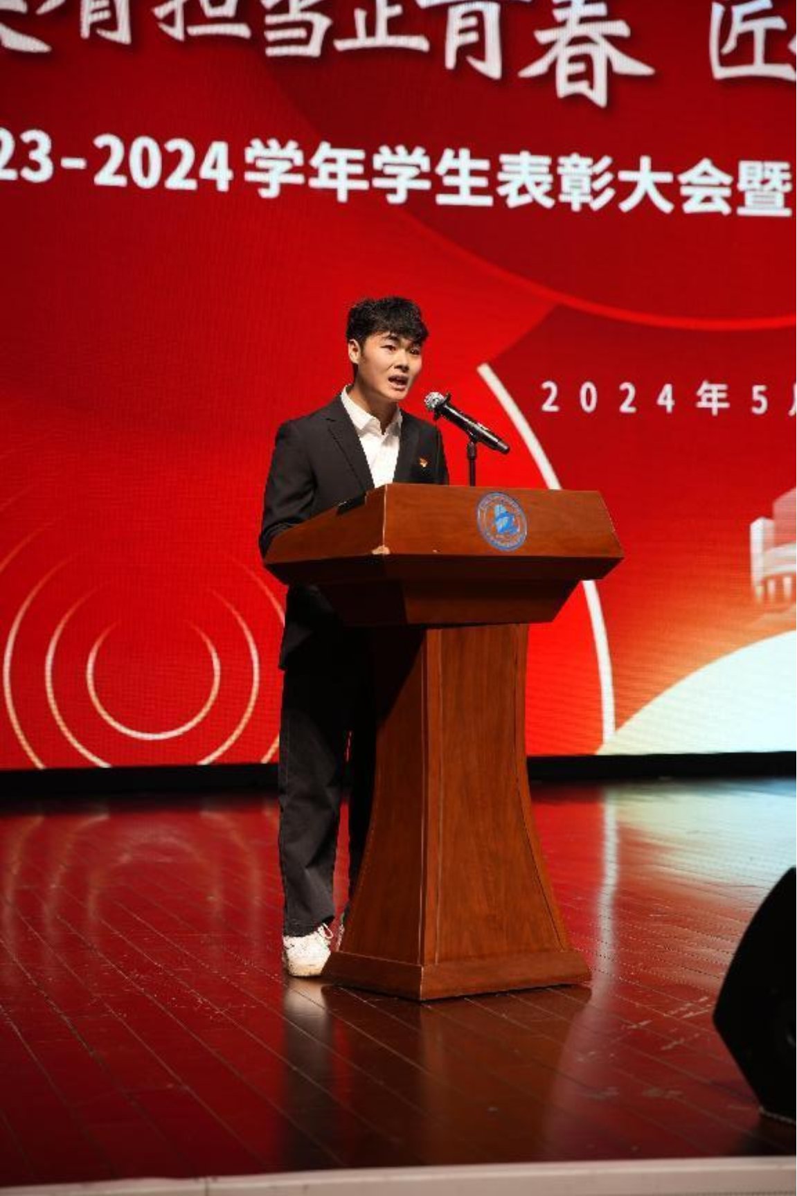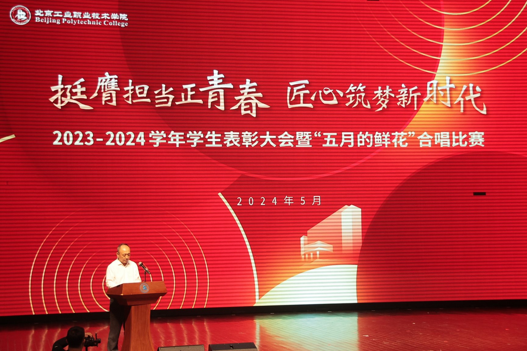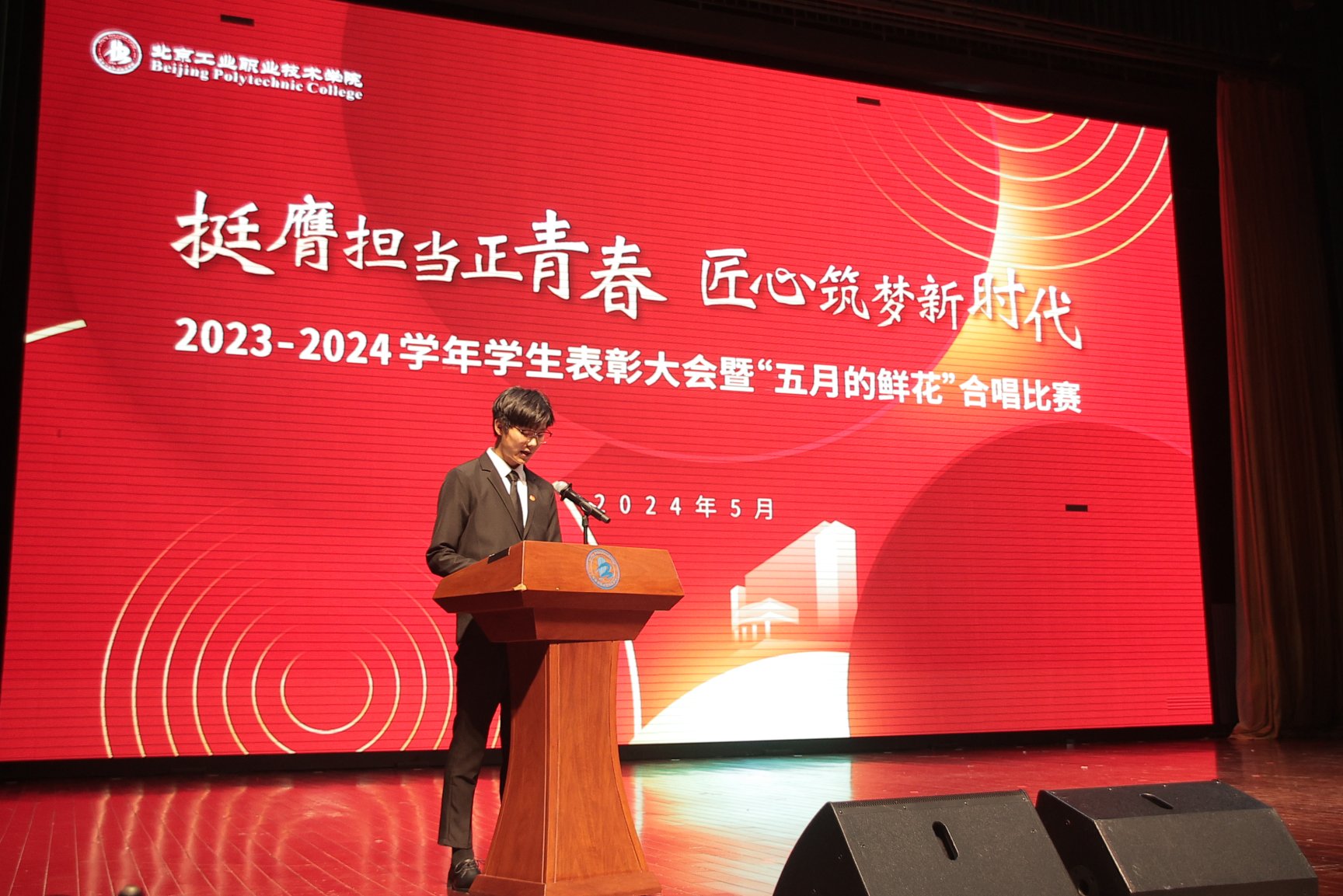 党委常委、副院长周燕宣读《关于表彰2023-2024学年各类学生先进集体和个人的决定》。建筑装饰2231班等3个班级获“北京市先进班集体”称号;机电2232班史硕等5名同学获“北京市三好学生”称号;网络2132班吴世龙等3名同学获“北京市优秀学生干部”称号;贯通2205班团支部等10个团支部获“校级优秀团支部”称号;测量2231高清山等120名同学获“校级优秀共青团员” 称号;网络2231郭淑雨等120名同学获“校级优秀共青团干部”称号;孔融、马加予获“校级优秀留学生”称号;一号学生公寓机电2334 班 618 室等10个宿舍获“校级优秀宿舍”称号;工商管理2231孙丽等15名同学获“校级优秀志愿者”称号。