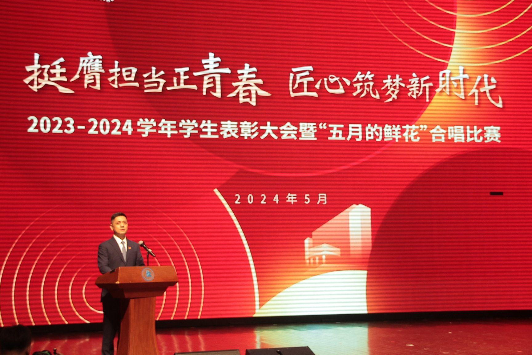 为深入学习贯彻习近平新时代中国特色社会主义思想,表彰先进、树立榜样,营造表彰育人、典礼育人的良好氛围,激励全校团员青年开拓创新、奋勇进取、挺膺担当。5月31日,我校在礼堂举办“挺膺担当正青春、匠心筑梦新时代”——2023-2024学年学生表彰大会暨“五月的鲜花”合唱比赛。全体校领导、相关职能部门负责人、各二级学院党政领导班子成员、全体班主任辅导员、教师代表、学生青马班学员、学生代表参加大会。会议由校团委书记郑兴主持。
