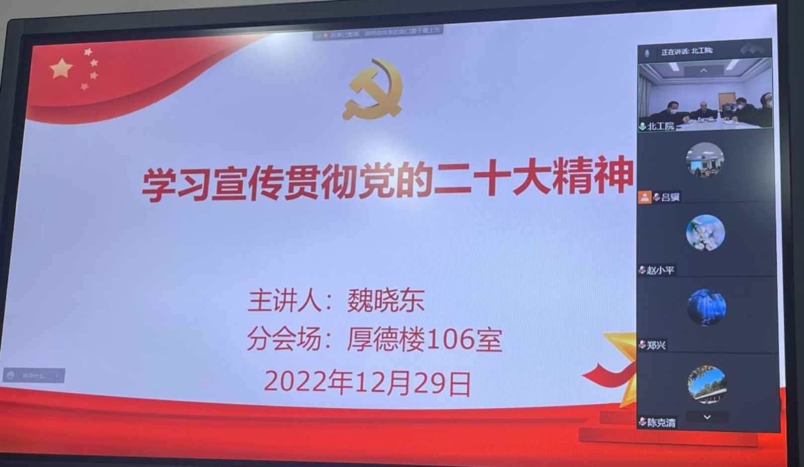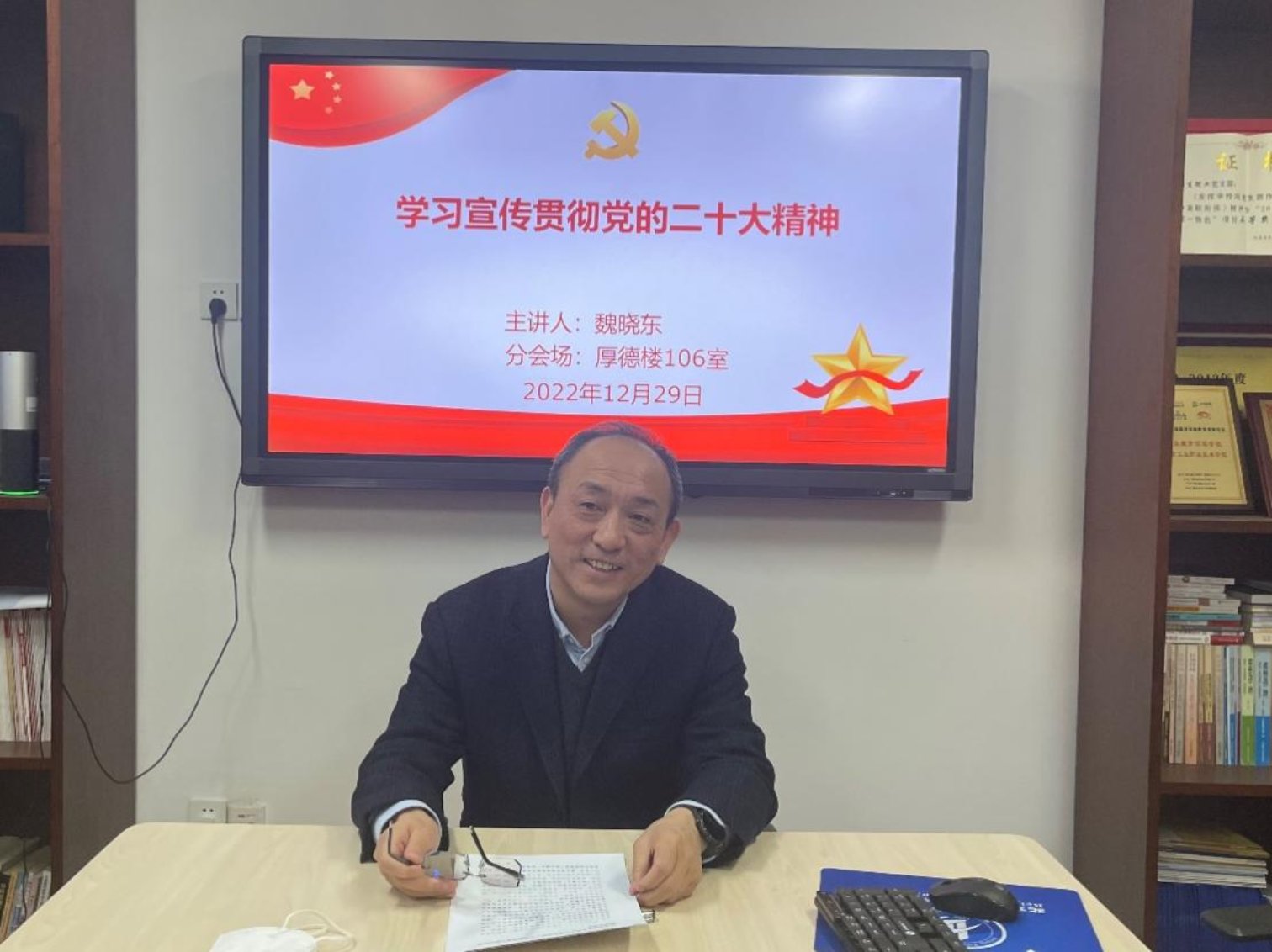 为持续深入学习宣传贯彻党的二十大精神,推动党的二十大精神深入基层、深入一线、深入师生,12月29日上午,开云网党委副书记魏晓东采用“线上+线下”方式,为学工联合党总支、建筑工程与测绘学院党总支和校工会的党员干部开展党的二十大精神专题宣讲会,会议由学工联合党总支书记贺继伟主持。
