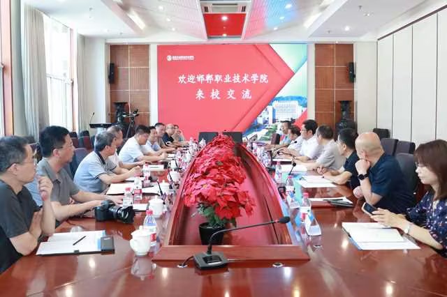 7月6日,邯郸职业技术学院党委书记杨华云,党委委员、副院长张长声等一行11人来我校调研交流。我校党委副书记、院长安江英,党委常委、院长助理谢光辉参加此次调研交流。