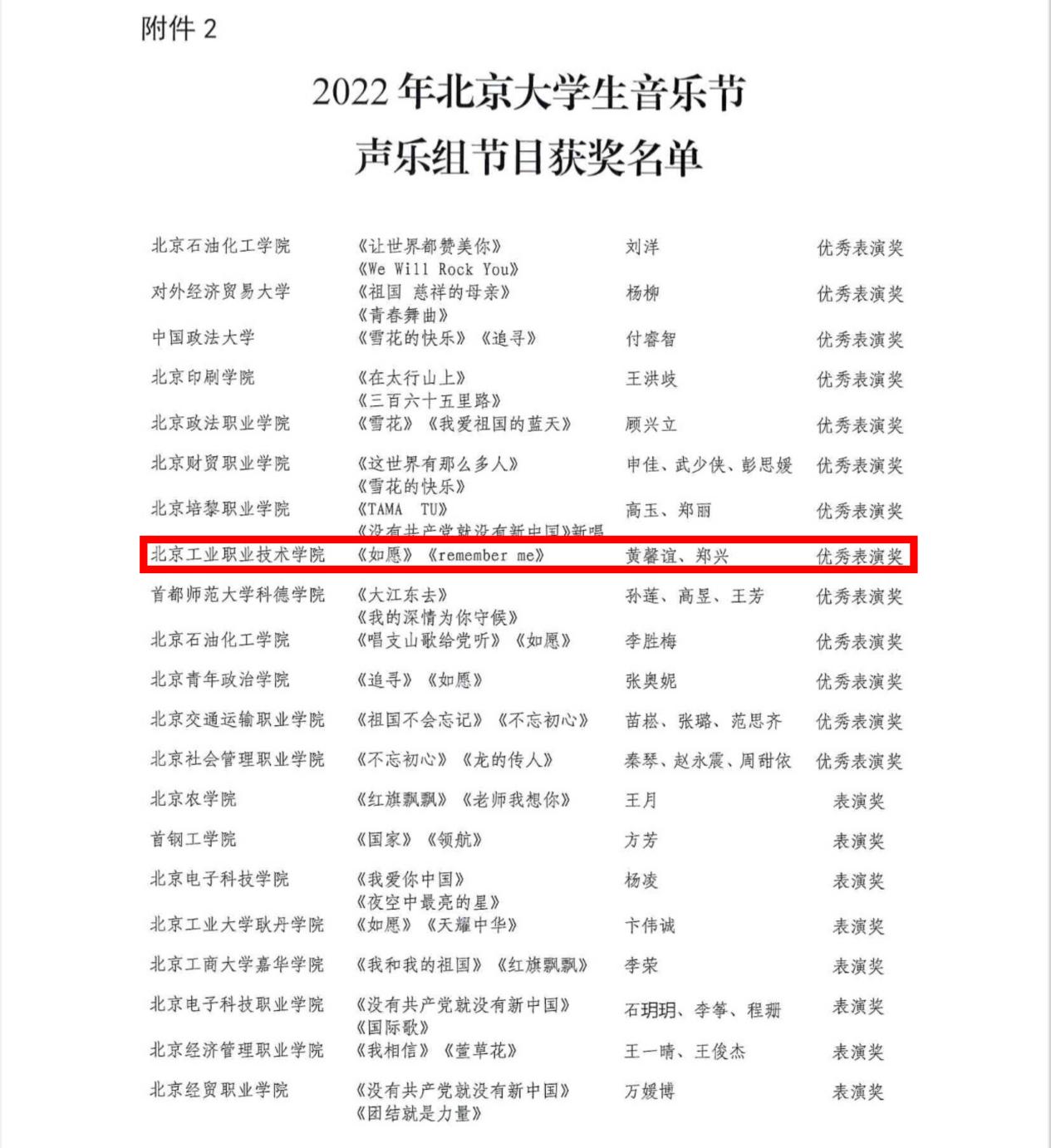 近日,由市委教育工委、市教委举办的2022年北京大学生音乐节系列活动落下帷幕。本届音乐节共有来自北京的66所高校、322作品参赛。经过激烈角逐,我校“梦之声”合唱团表演的作品《如愿》、《remember me》受到了专家评委的高度评价,在2022年北京市大学生音乐节声乐组获得优秀表演奖。