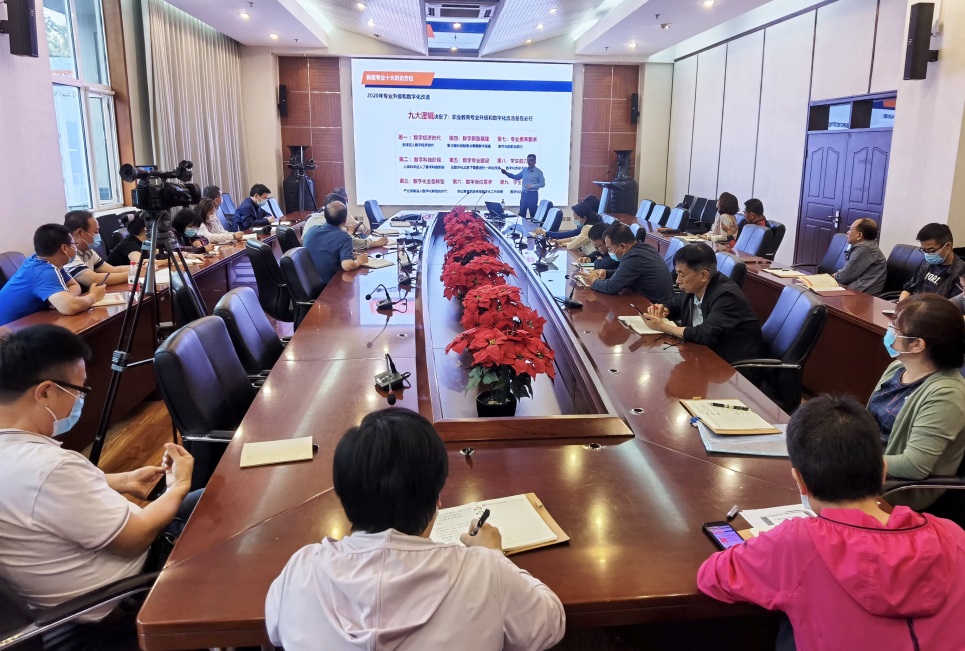 刘兰明副校长结合亲身工作感受畅谈关于教育部推动职业院校专业的数字化改造情况,他以新闻传播类、教育与体育大类、公安与司法大类为例,从找准历史方位的新目录、紧盯生产生活的新需求、提升目录研制的适配性以及力求落地落实的高质量四部分介绍了新专业十大历史定位、新经济带来的市场需求变化、新技术带来的行业升级挑战、新职业带来的岗位供需变化等具体内容,进一步阐释了新专业目录修订的重要意义。