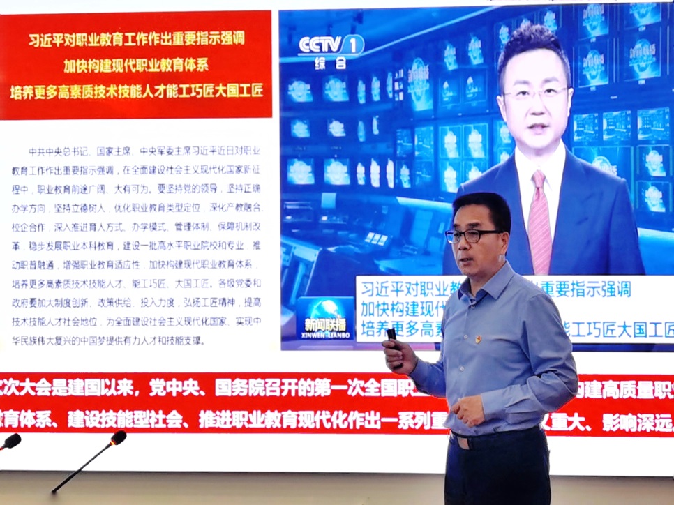 刘兰明副校长对全国职教大会精神进行了解读。从职业教育前途广阔,大有可为;坚持社会主义办学方向;走类型特色的发展道路;高度重视,稳健落实大会精神等四个部分全面介绍了全国职业教育大会召开时代背景、丰富内涵以及对于深化职业教育改革的重要意义。