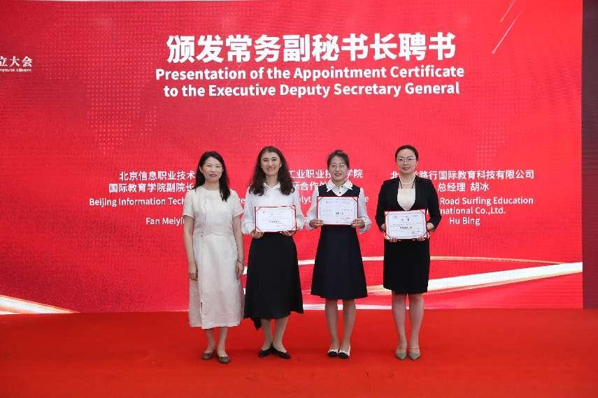 大会经过充分的酝酿和讨论,与会代表一致通过了《京津冀职业教育国际化合作发展联盟章程》,明确了联盟的宗旨、任务、组织架构和运行机制等。大会选举产生联盟第一届理事会理事长单位、常务副理事长单位、常务理事单位、副理事长单位等并聘任各主要岗位,成立联盟专家工作委员会并聘任国内外30余名知名学者担任特聘专家、特聘外籍专家,为联盟的规范运作和长远发展提供了有力的组织保障。随后,举行了隆重的揭牌仪式,与会领导和嘉宾共同见证了这一历史性的时刻。我校担任常务副理事长单位,国际处处长孟晴担任联盟常务副理事长职务、国际处王瀛担任常务副秘书长职务。