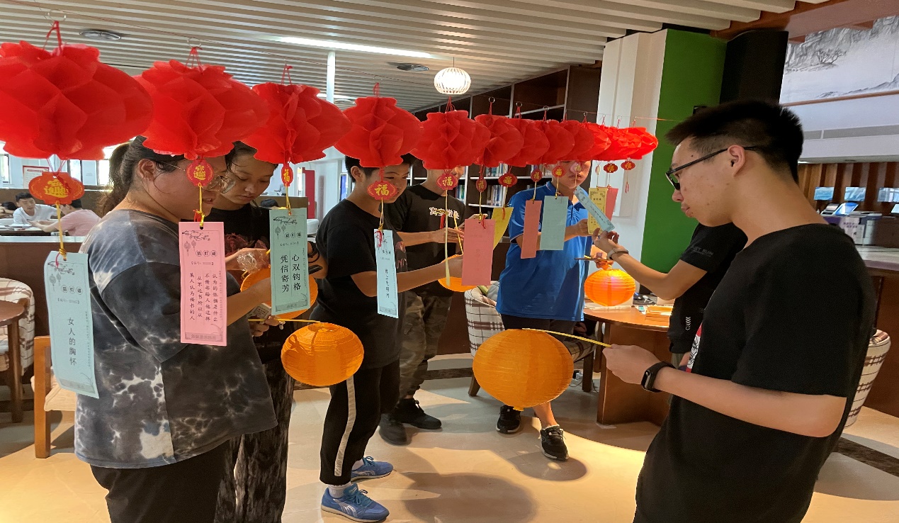 活动主要包含制作灯笼和猜灯谜两部分,在制作灯笼活动中。同学们在图书馆一层大厅有序领取制作材料,在听取中秋故事及制作讲解后,大家纷纷开始动手制作。有的同学在灯笼上画出月兔的图案,有的同学在灯笼上写下中秋诗句,各具特色。