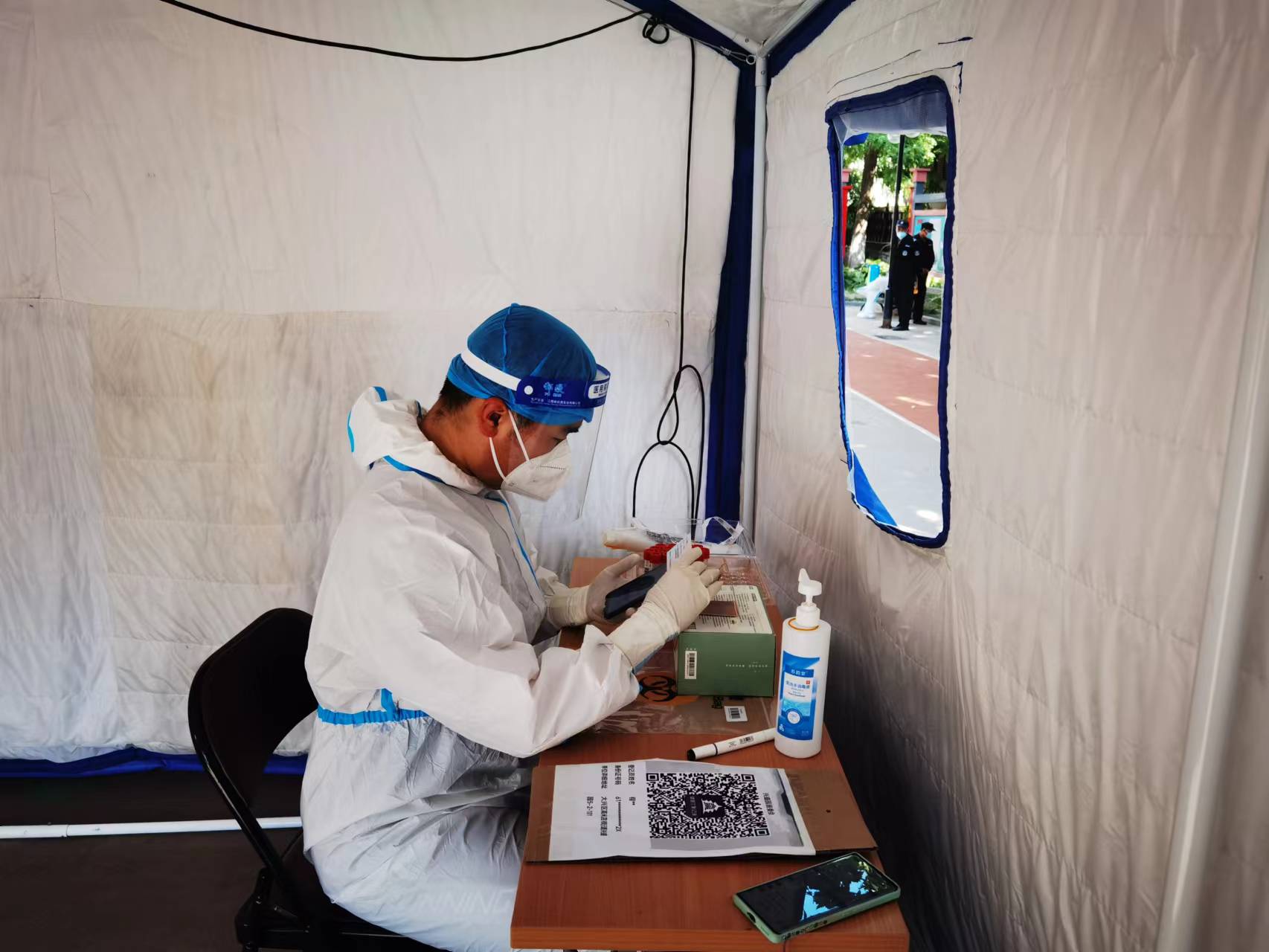 机电2032班的杨硕正在负责核酸检测的证件扫描工作