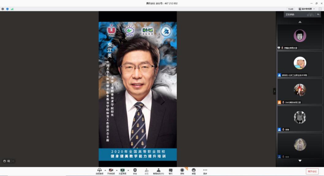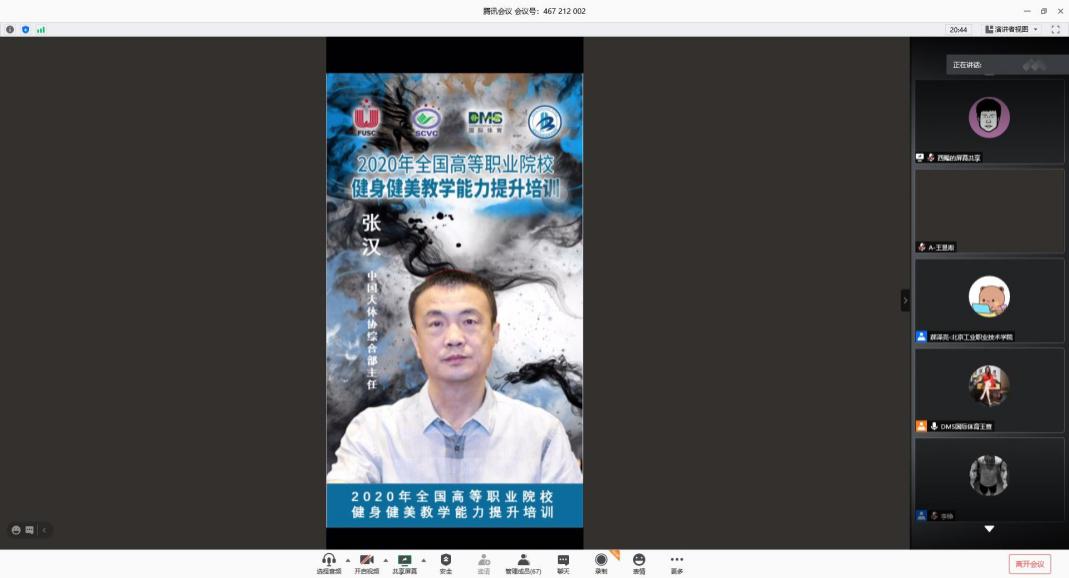 由我校承办的2020年全国高等职业院校健身健美教学能力提升培训班,于9月26日早上8:40在线上开班。中国大学生体育协会职业教育开云网体育工作委员会主席、开云网校长安江英,中国大学生体育协会综合部主任张汉,中国大学生体育协会职业教育开云网体育工作委员会秘书长贾书申,北京梦肌肉体育发展有限责任公司CEO王萱等领导嘉宾出席线上开班仪式。