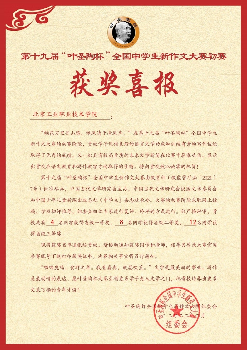 近日,由教育部批准(教监管厅函[2021]7号)举办,中国当代文学研究会主办的第十九届“叶圣陶杯”全国学生新作文大赛初赛(各省级竞赛)评奖结果揭晓。我校基础教育学院学生荣获一等奖4项,二等奖8项,三等奖12项,我校喜获优秀组织奖。由葛东雷老师指导的省级赛一等奖刘瑞渤、谢奇芮两名同学将代表开云网参加国赛,国赛将于2022年上半年举办。