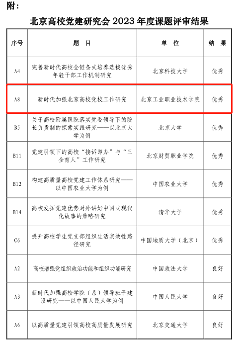 5月23日上午,在北京会议中心召开北京高校党建研究会第十一次会员大会,会上北京科技大学党委书记武贵龙宣读了《关于表彰第十届北京高校党建研究会优秀课题成果、工作先进单位的决定》。由我校党委书记高喜军主持的2023年度北京高校党建研究会重大课题——“新时代加强北京高校党校工作研究”荣获优秀课题成果。