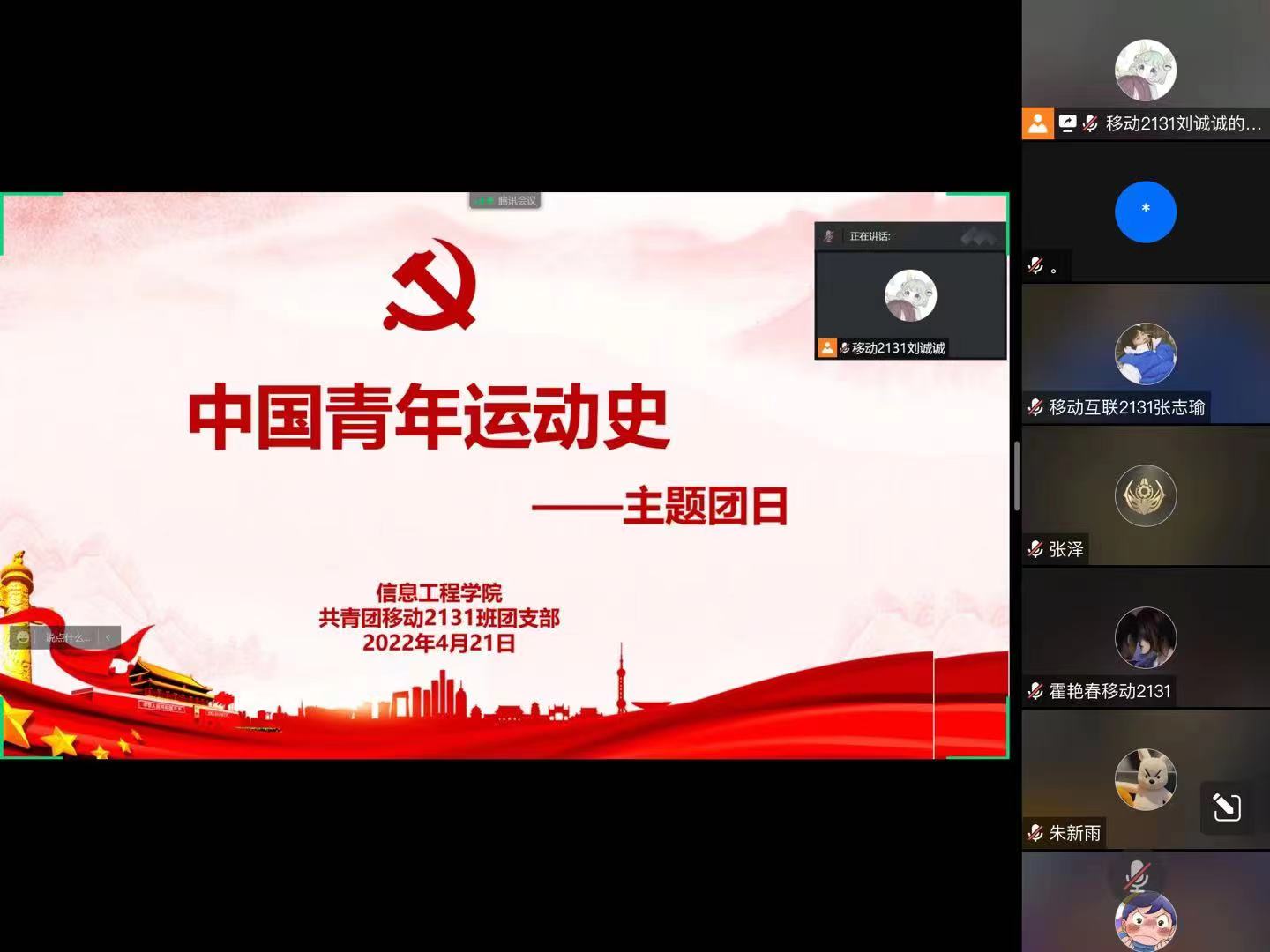 信息工程学院团总支组织开展“党的青年运动史”线上专题学习。本次专题活动由各班团支书带领同学们学习在中国共产党领导下广大青年在革命、建设、改革不同历史时期接续奋斗、建功立业的事迹。通过专题讲解学习,激励青年坚定跟党走的决心,高扬爱国主义旗帜,坚持永久奋斗、不懈奋斗的精神气质。信息工程学院团总支副书记王新宇同学表示:通过学习党的青年运动史,我感受到一定要努力学习科学文化知识,在踏入社会之后回报祖国、社会和家庭。