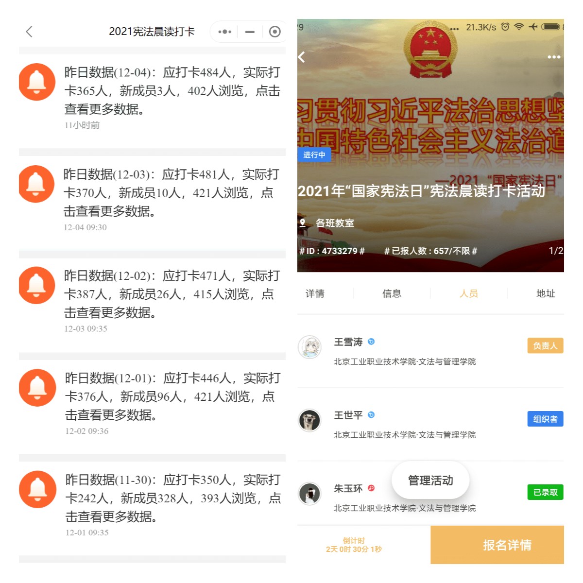 文法与管理学院懿来读书社负责登录校团委打卡平台,为同学们参加活动发放学习积分,激励同学们参与到第二课堂法治宣传教育中来。11月29-12月5日宪法宣传周活动期间,共有来自全校4个学院657名同学参与到宪法晨读打卡学习中,累计打卡1740次。