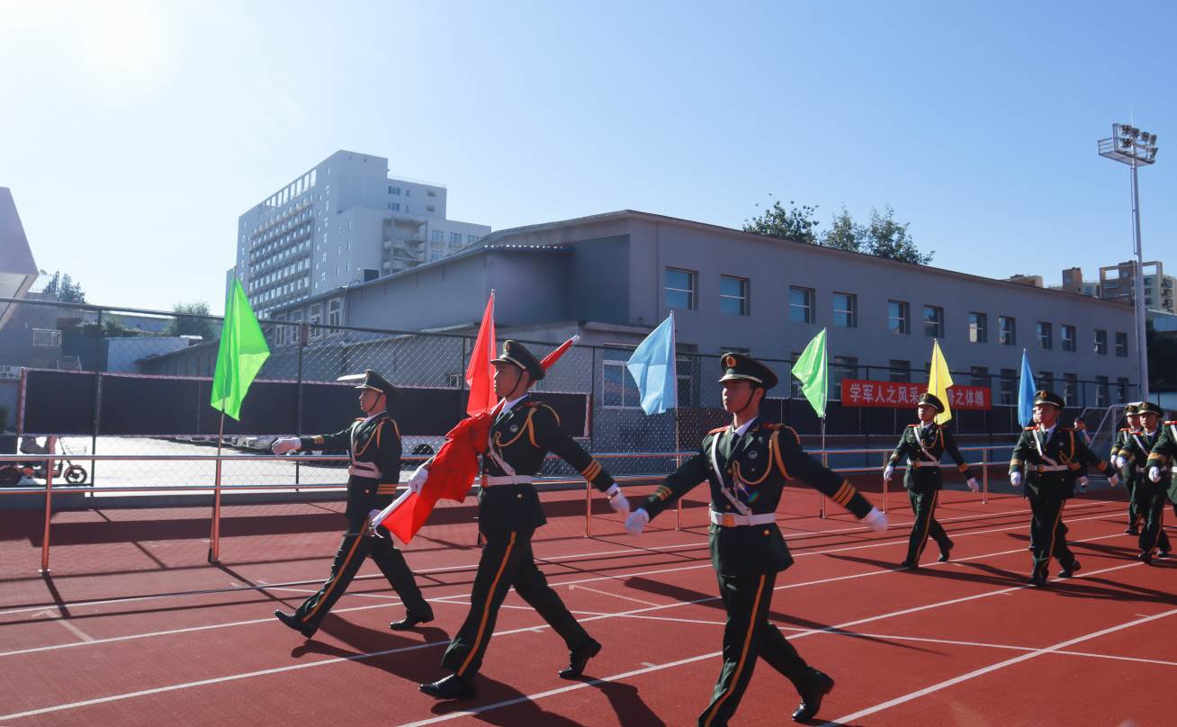 开学典礼结束后,进行新生军训开营仪式。全体师生庄严肃立,迎接校旗。