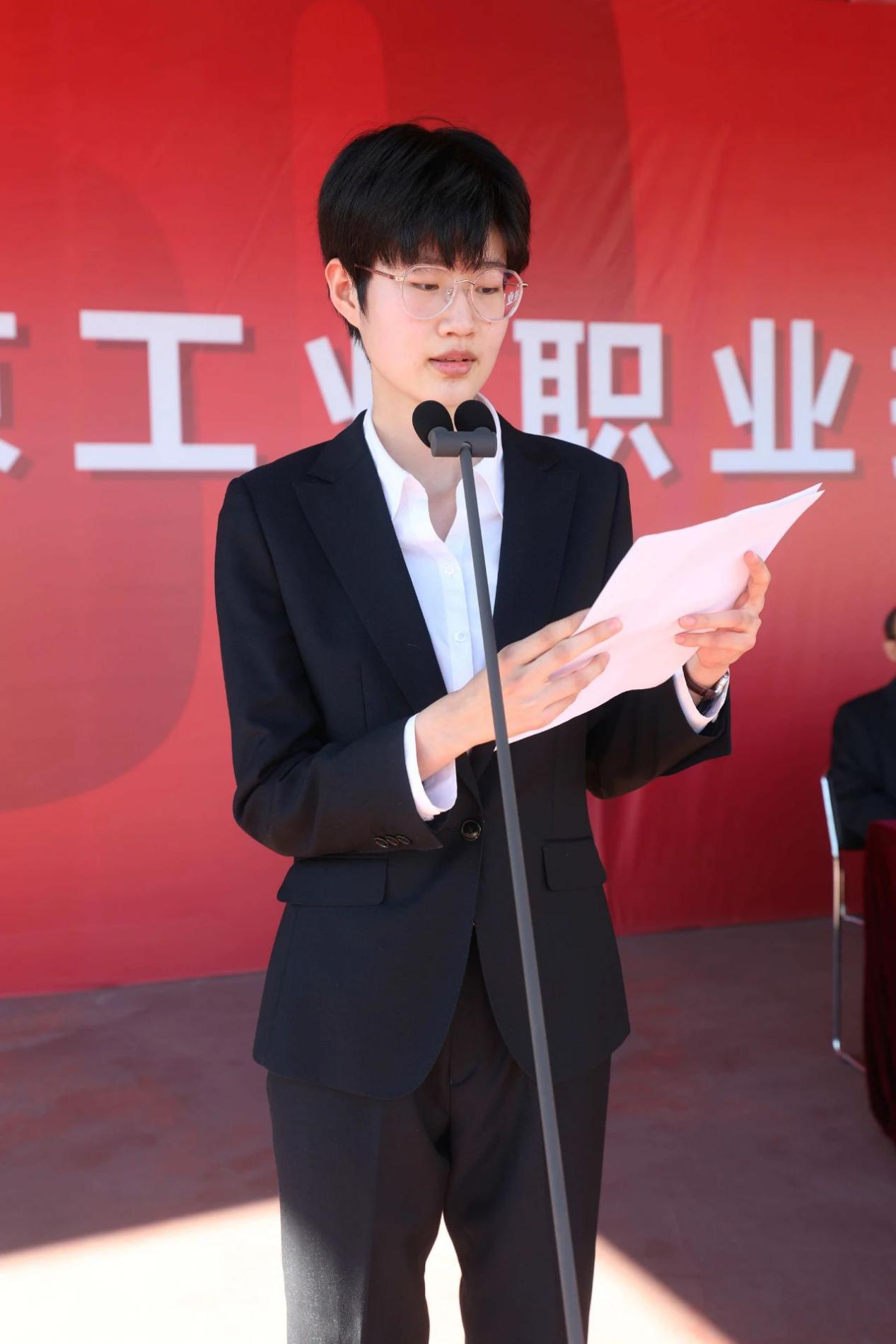 文法与管理学院会计1931班的赵雅楠代表在校生对新生表示了由衷的祝贺和热烈的欢迎。她与新同学们分享了在北工院的学习、生活的经验。号召大家珍惜大学生活,遵纪守法,认真学习,踏实做好本职工作,拥有积极乐观、实事求是的生活态度,做一个追逐目标奔跑的人。
