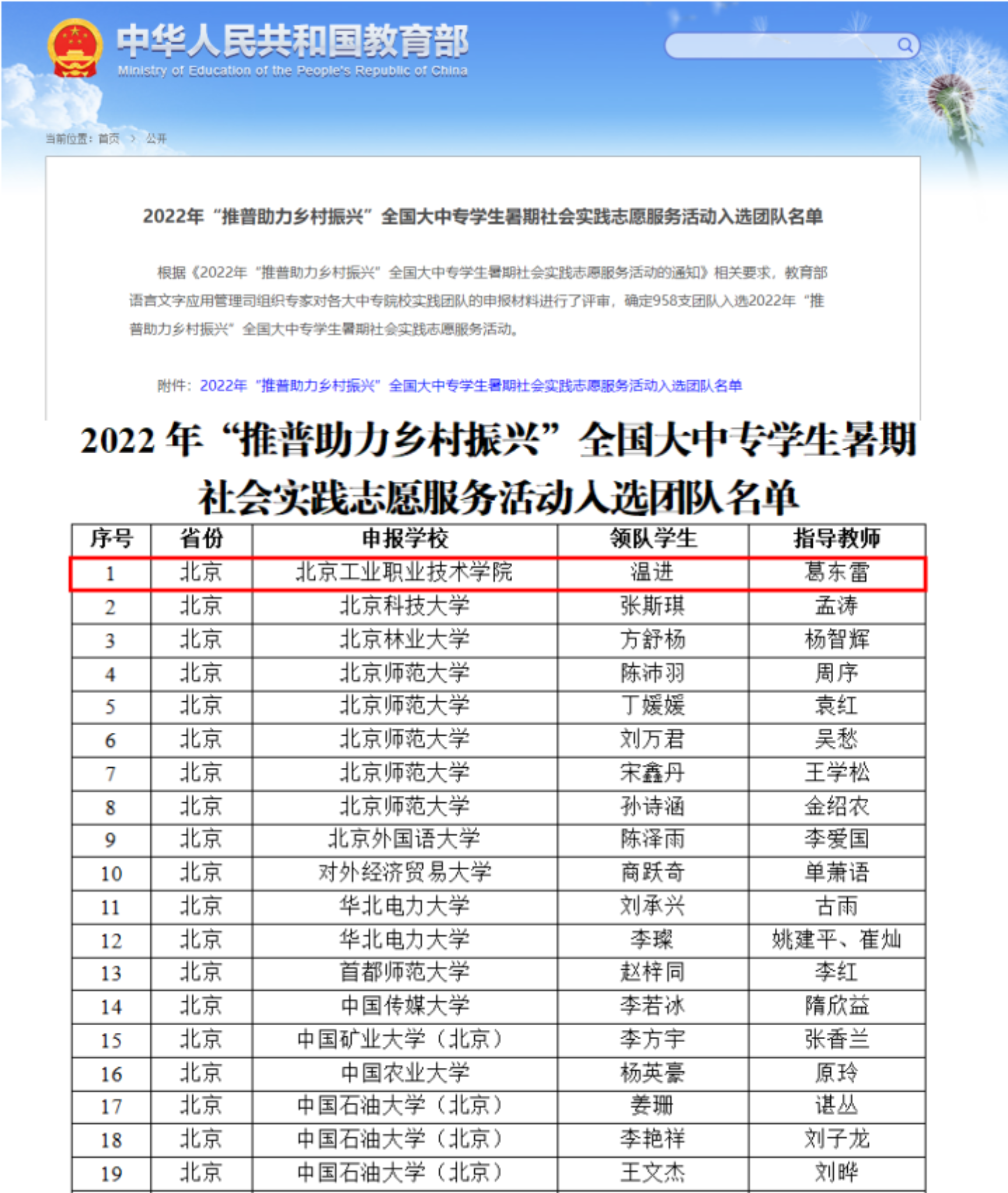 近日,教育部、团中央公布了2022年“推普助力乡村振兴”全国大中专学生暑期社会实践志愿服务活动入选团队名单,由我校基础教育学院葛东雷老师任指导教师、温进同学任队长的“北工院语文学会推普实践团”成功入选。北京市共有来自16所高校的36支队伍入选,我校为唯一入选的高等职业院校。