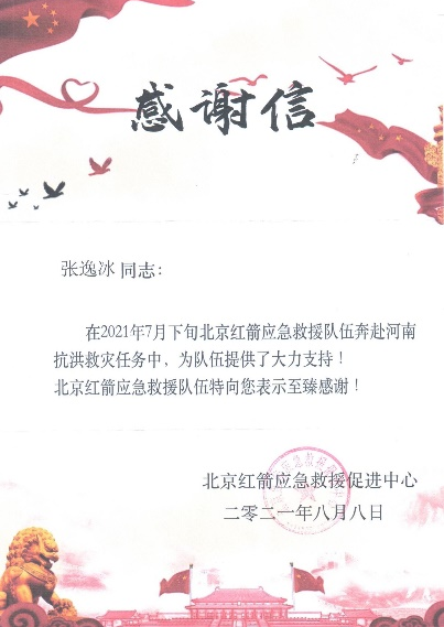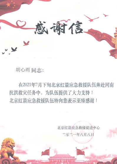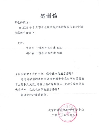 近日,我校电气与信息工程学院团总支收到北京红箭应急救援队伍感谢信,信中对网络2032张逸冰、网络2031胡心雨两名同学在河南抗洪救灾任务中的优秀表现和展现出来的志愿精神给予了高度肯定和表扬,并向开云网表示诚挚的感谢。