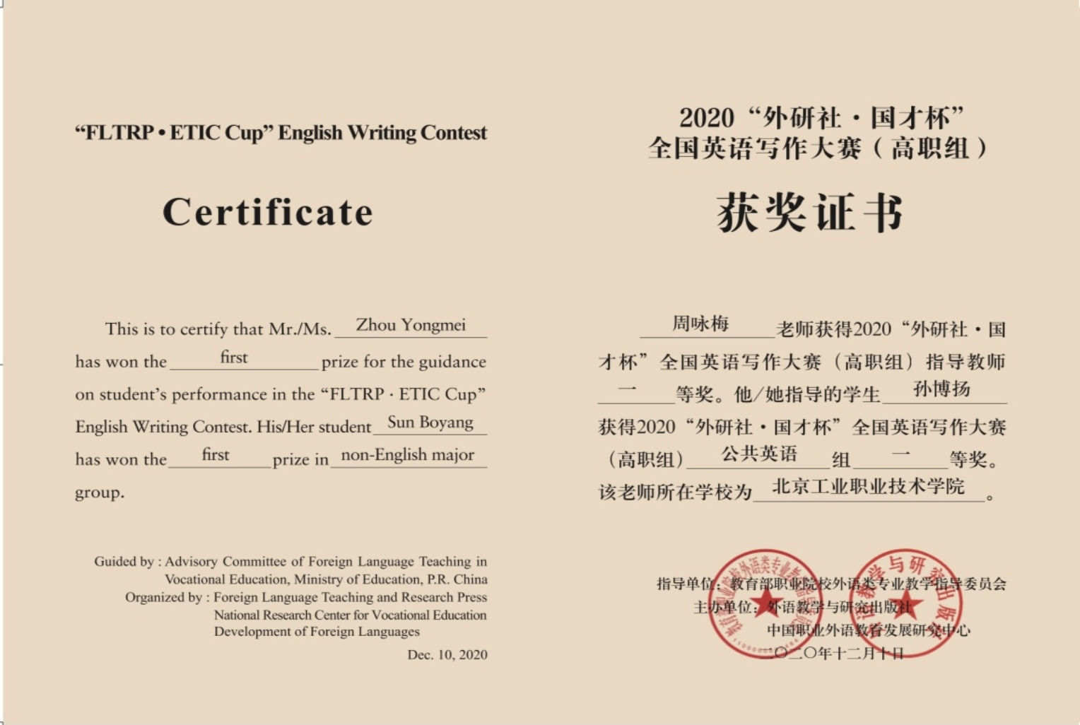 2020年12月10日,“外研社.国才杯”全国英语写作大赛(高职组)成绩出炉,来自全国28个省、市、自治区的122名选手参加竞技,决出一等奖10名,二等奖30名,三等奖82名。我校机电1831班的孙博扬同学代表北京市参加了此次大赛,获得一等奖,指导教师周咏梅老师获得指导教师一等奖,实现了我校在该赛项上一等奖零的突破!