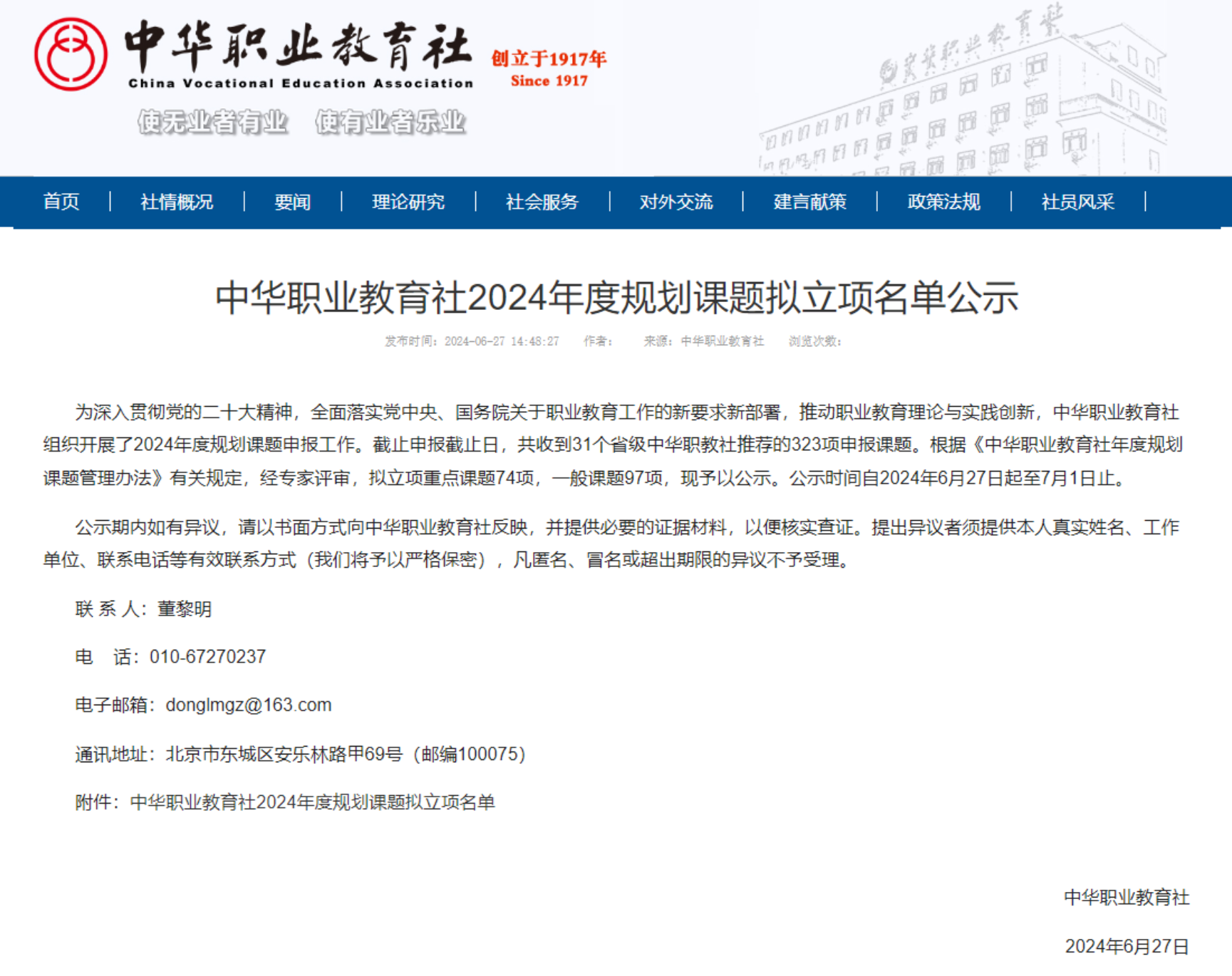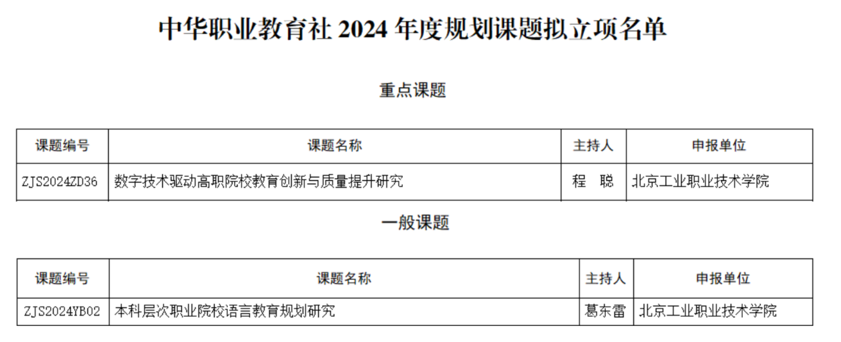 近日,中华职业教育社公布了2024年度规划课题拟立项名单。我校信息工程学院程聪教授主持的课题《数字技术驱动高职院校教育创新与质量提升研究》(课题编号:ZJS2024ZD36)获批重点课题;基础教育学院葛东雷博士主持的课题《本科层次职业院校语言教育规划研究》(课题编号:ZJS2024YB02)获批一般课题。