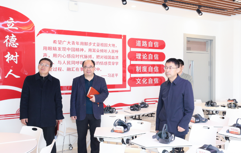 柳长安察看了马克思主义学院思政课虚拟仿真体验教学中心、教学(行政)办公室、教研室,现场体验了思政课虚拟仿真课程资源,详细了解马院办公场所布局和教学条件建设。