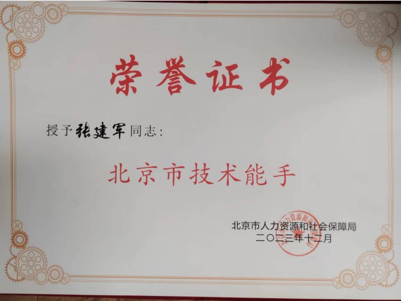 近日,北京市人力资源和社会保障局公布了“北京市技术能手”获得者名单,我校张建军老师被授予“北京市技术能手”称号。