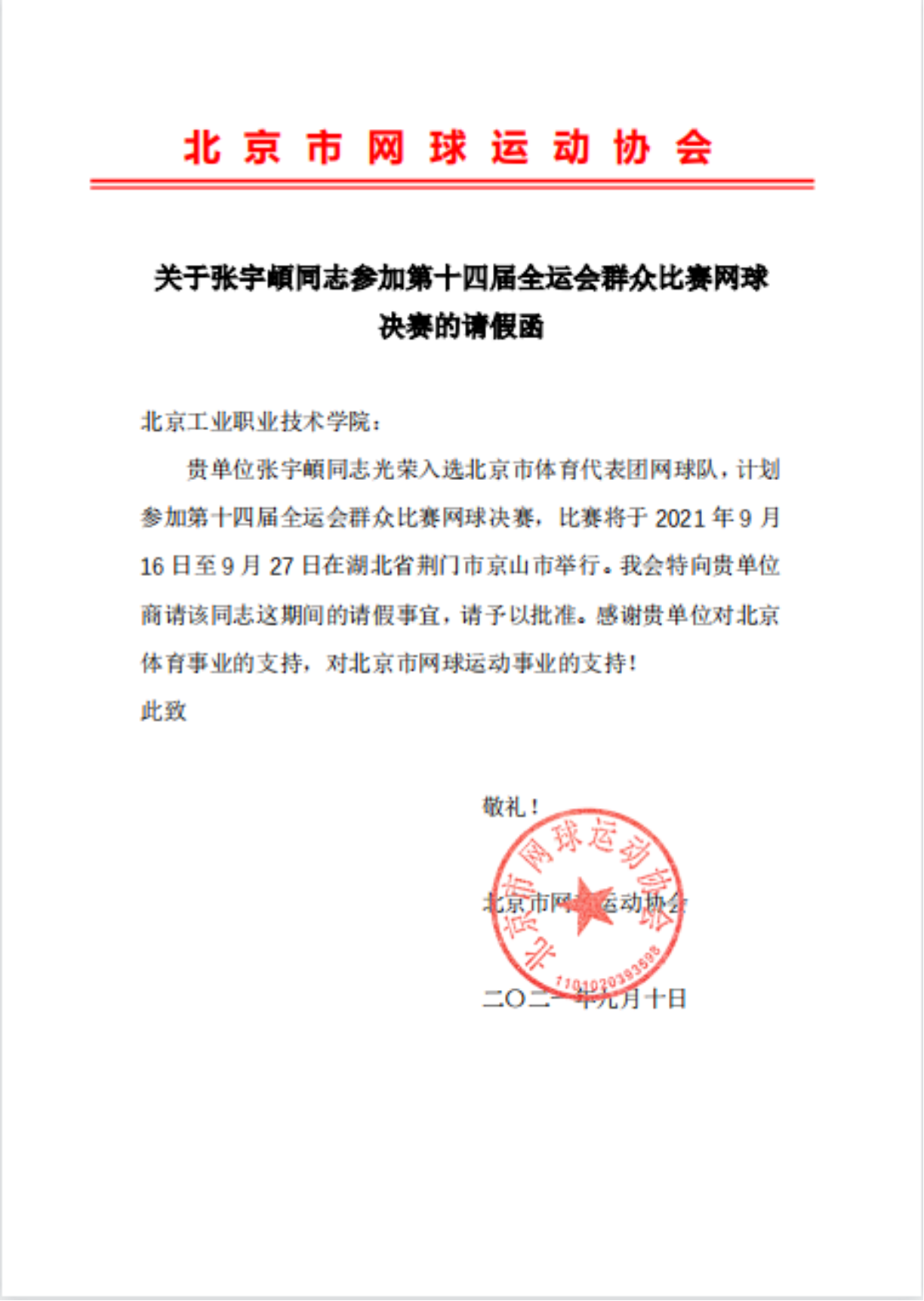 经北京市网球运动协会前期选拔,我校张宇頔老师光荣入选北京市体育代表团参加第十四届全运会群众比赛网球决赛。