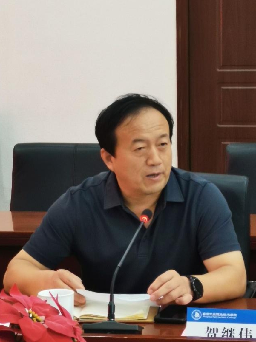 建筑与测绘工程学院党总支书记贺继伟介绍了建筑与测绘工程学院的基本情况,并提出要紧跟国家职业教育改革步伐,深化产教融合校企合作,积极打造首都高质量发展的复合型国际化技术技能人才培养高地。