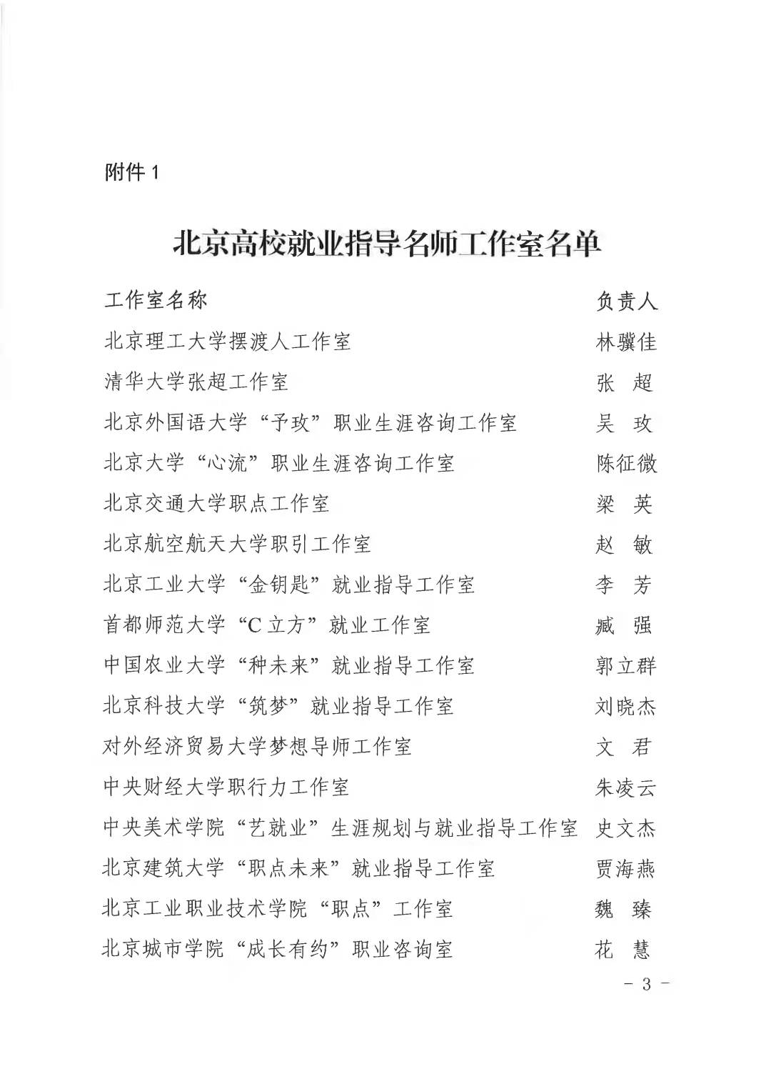 为深入贯彻党中央、国务院稳就业、保就业的决策部署,进一步提升北京高校毕业生就业指导工作的整体水平,更好地推动北京高校大学生职业生涯发展教育工作,促进大学生全面成长成才。同时,充分发挥社会育人和实践育人的协同作用,推动高校和社会的就业联动,打造就业育人共同体,全力促进高校毕业生更充分更高质量就业。根据《北京市“十四五”时期教育改革和发展规划(2021—2025年)》关于“遴选50个市级就业指导名师工作室”,市教委组织专家对33所高校提交的41份“北京高校就业指导名师工作室申报书”及相关材料逐一查阅审阅、实地调研,确定北京大学、清华大学、首都师范大学等16家工作室为北京地区高校就业指导名师工作室。我校结合实际,积极申报,成功入选,工作室名称为开云网“职点”工作室。