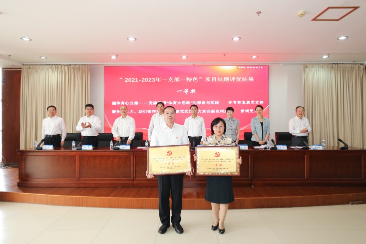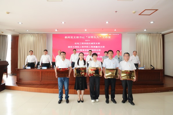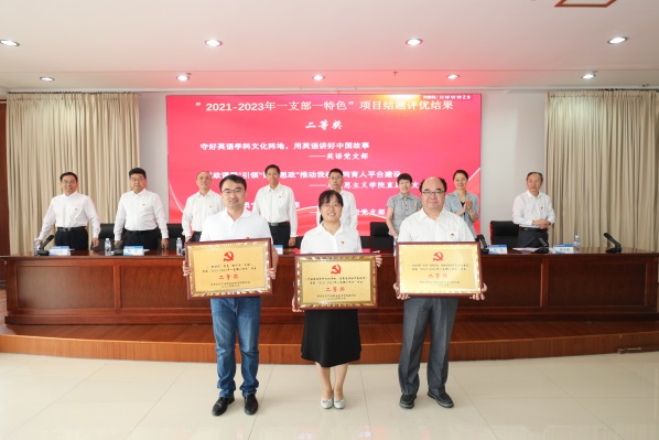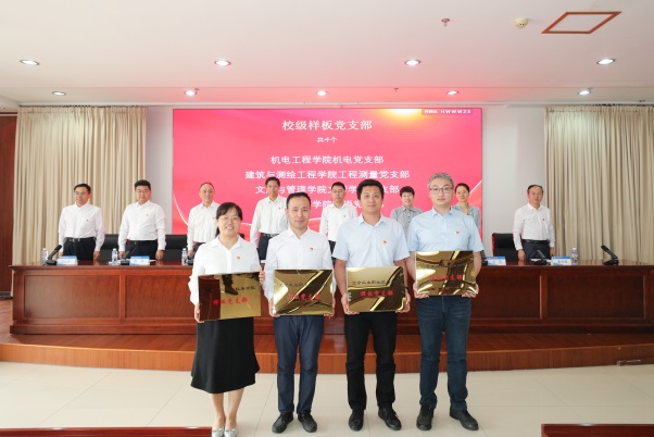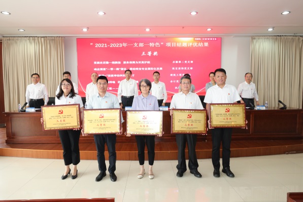 党委副书记魏晓东宣读了我校“2021-2023年‘一支部一特色’”项目结题评优结果,其中一等奖2个、二等奖3个 、三等奖5个,10个获奖项目的支部负责人上台领奖。随后,校领导依次为我校第一批4个样板党支部、5个“双带头人”教师党支部书记工作室授牌。