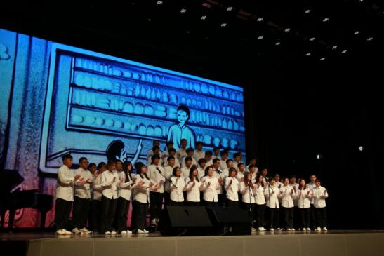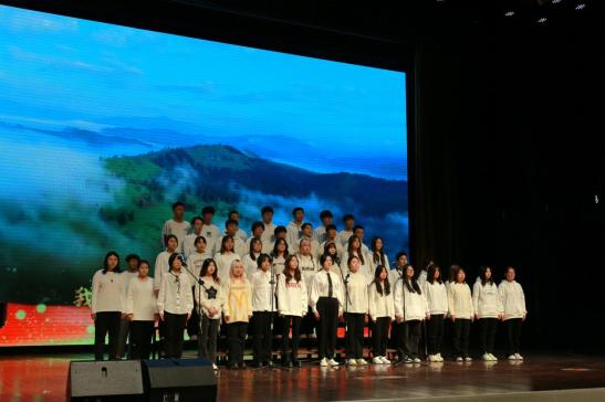 文法与管理学院合唱团演唱歌曲《在灿烂的阳光下》、《走向复兴》