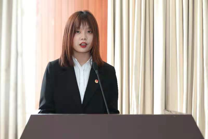 随后,新团员代表网络2032班杨梦涵同学上台发言。她承诺要更加努力学习团的理论知识和专业文化知识,在学习、工作、生活中起到模范带头作用,努力完成团组织交给的任务,自觉遵守团的纪律、执行团的决议,为共青团贡献自己的一份力量。