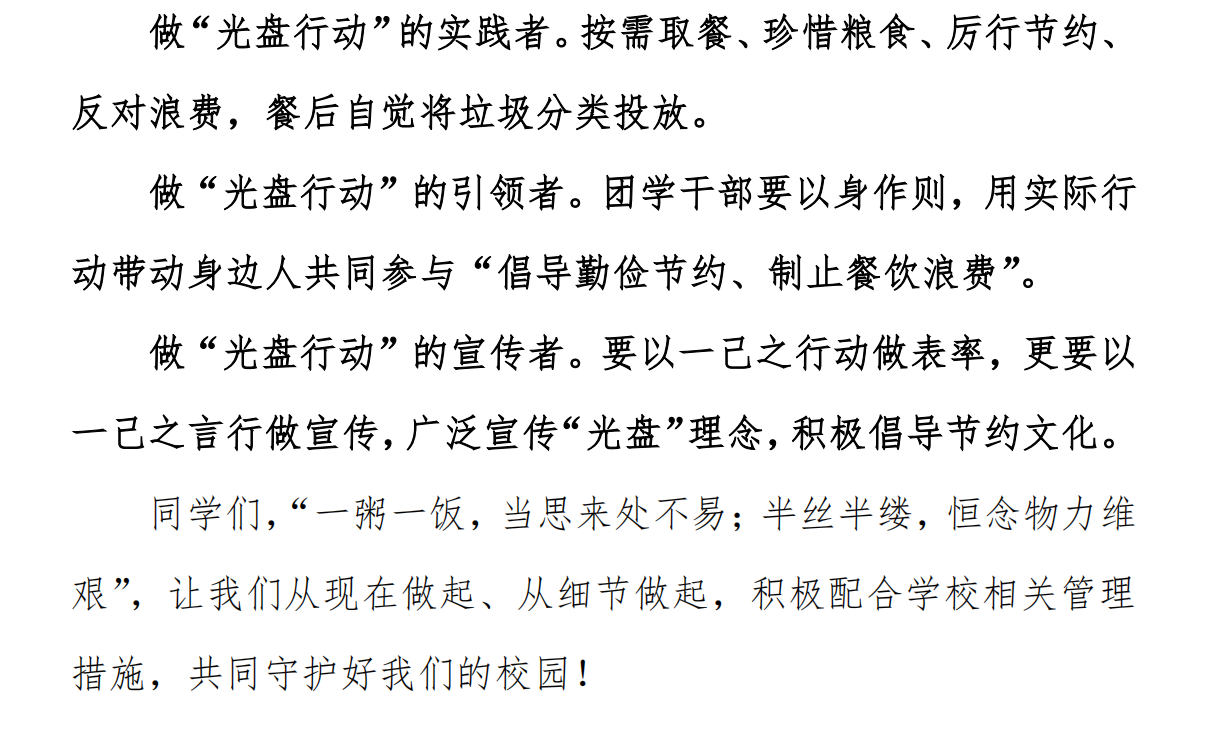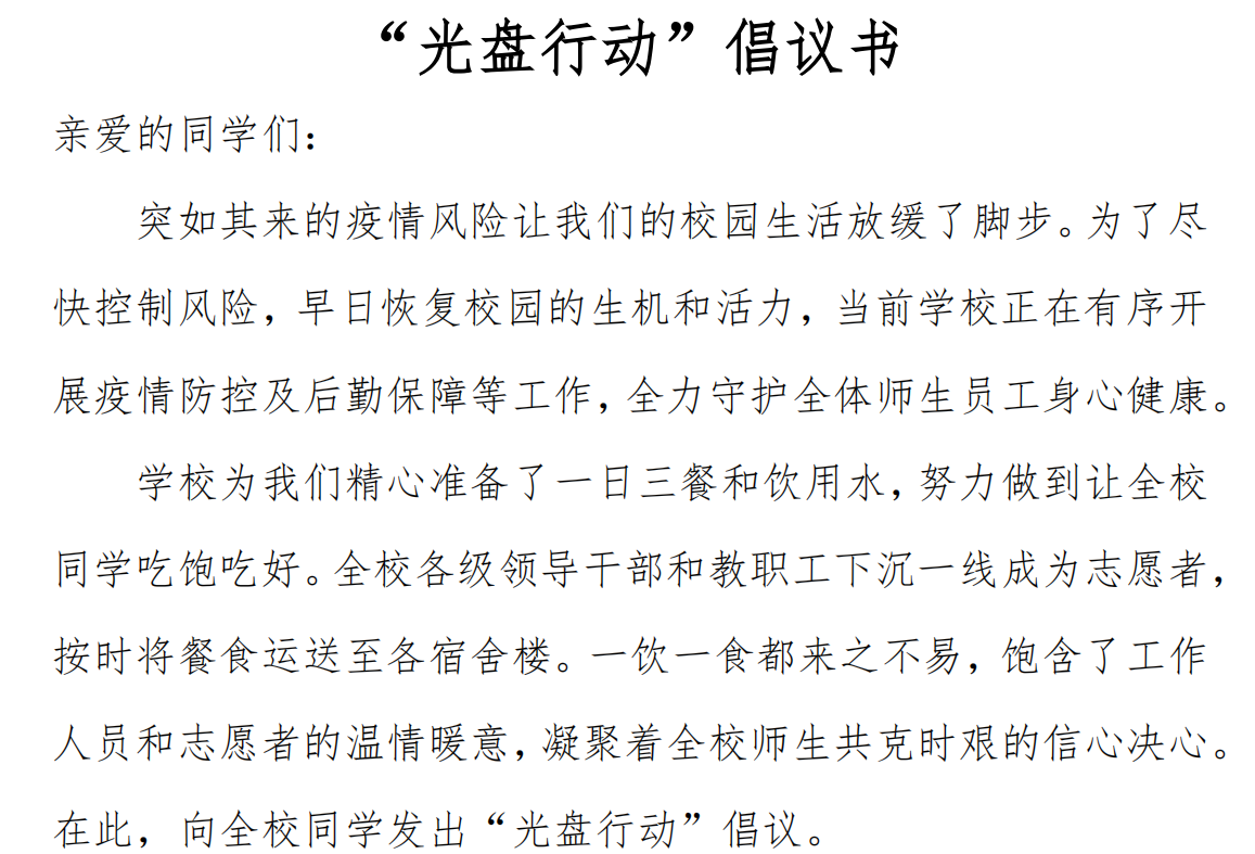 2022年11 月18日,开云网进入临时管控期,全校上下齐心协力共同努力抗击疫情风险。为引导同学们积极配合开云网管控措施,珍惜粮食、珍惜劳动,为疫情防控尽一份力量。校学生会向全体学生发出“光盘行动”倡议。