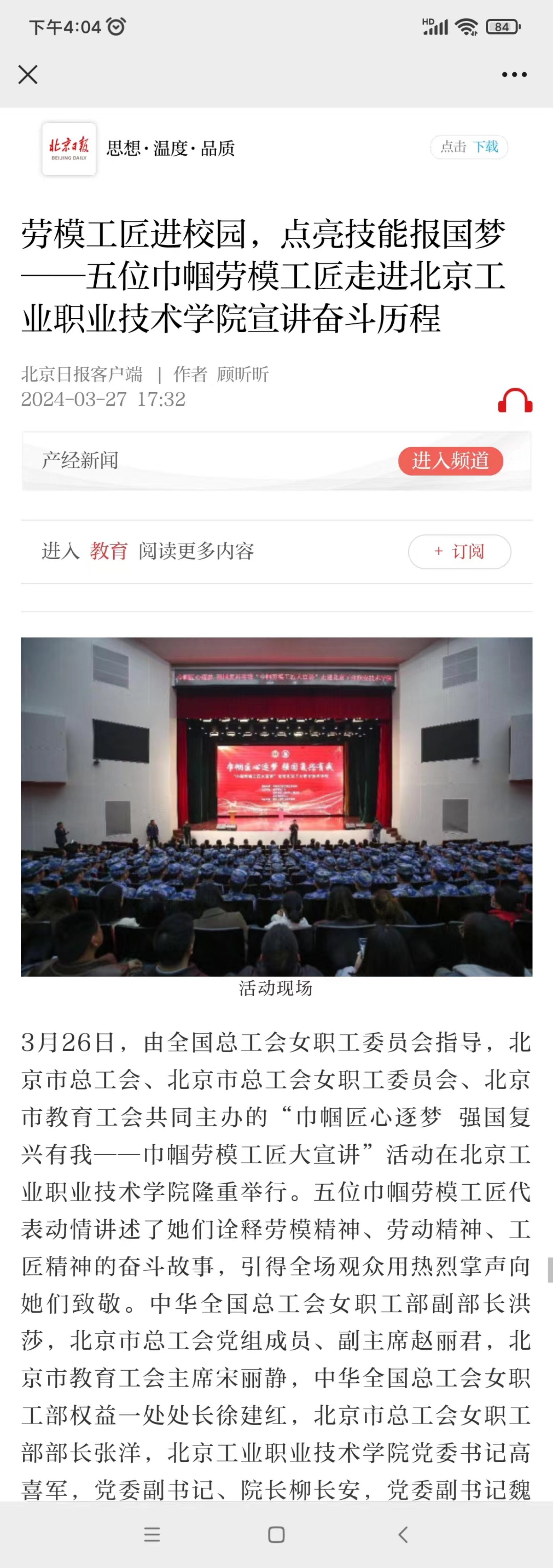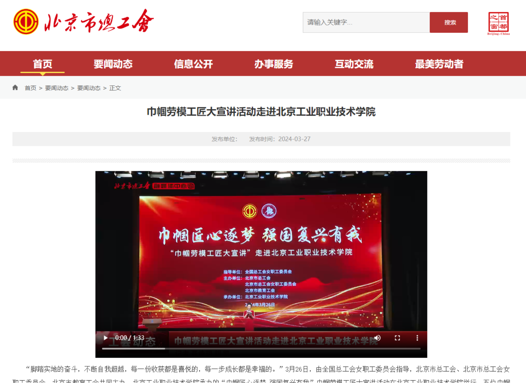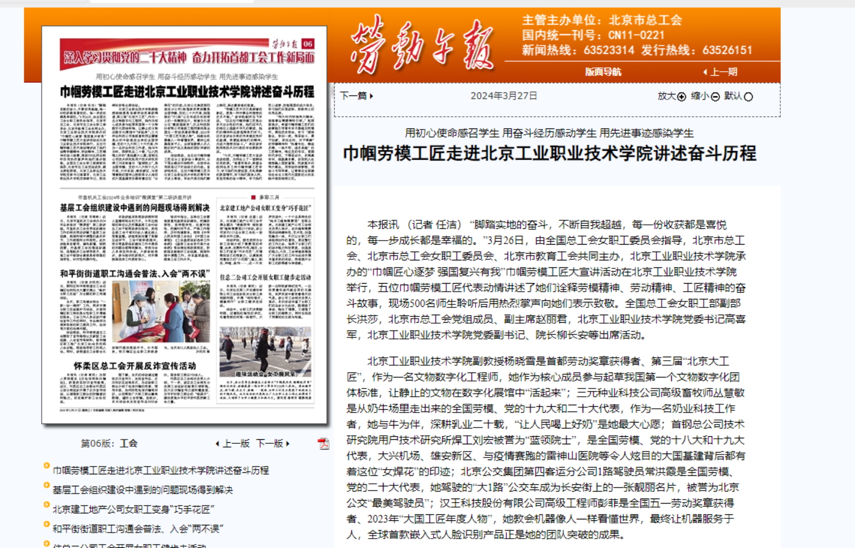 近日,“巾帼匠心逐梦 强国复兴有我”巾帼劳模工匠大宣讲活动在我校举行,五位巾帼劳模工匠代表动情讲述了她们诠释劳模精神、劳动精神、工匠精神的奋斗故事,现场600名师生聆听后用热烈掌声向她们表示致敬。《劳动午报》《北京日报》《现代教育报》等媒体纷纷关注报道,学习强国、中工网、今日头条、北京市总工会官网、财经新闻网等进行了转载。