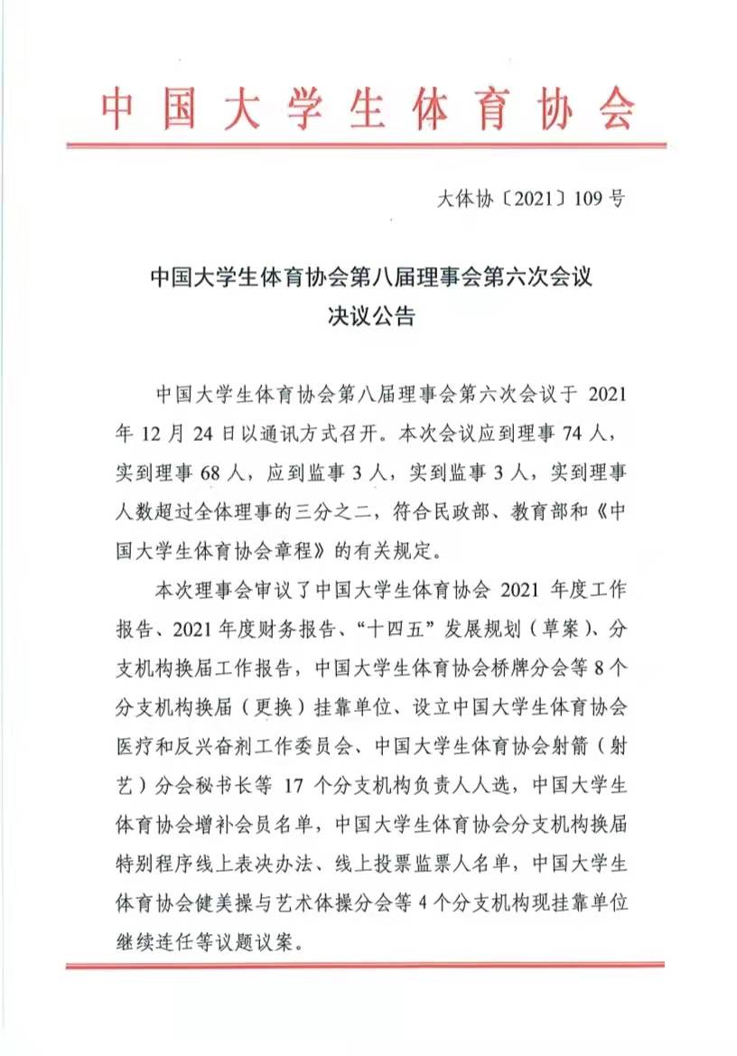 12月29日,经中国大学生体育协会第八届理事会第六次会议审议通过,最终我校以全票同意获得通过连任。安江英校长连任主席,体育部主任贾书申连任秘书长,秘书处继续设在体育部。