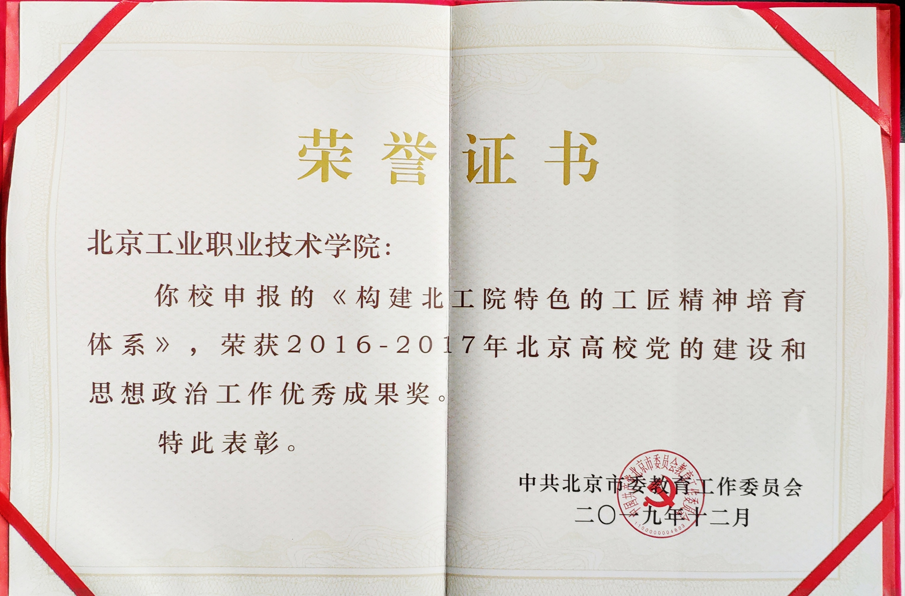 日前,北京市委教育工委颁发了2016—2017年北京高等开云网党的建设和思想政治工作优秀成果获奖证书,我校申报的《构建北工院特色的工匠精神培育体系》荣获优秀成果奖,成为北京高职院校唯一获此殊荣的院校。 据悉,北京市委教育工委组织此次评选,目的是深入学习贯彻习近平新时代中国特色社会主义思想和党的十九大精神,贯彻落实全国及全市教育大会、宣传思想工作会议、高校思想政治工作会议精神,...